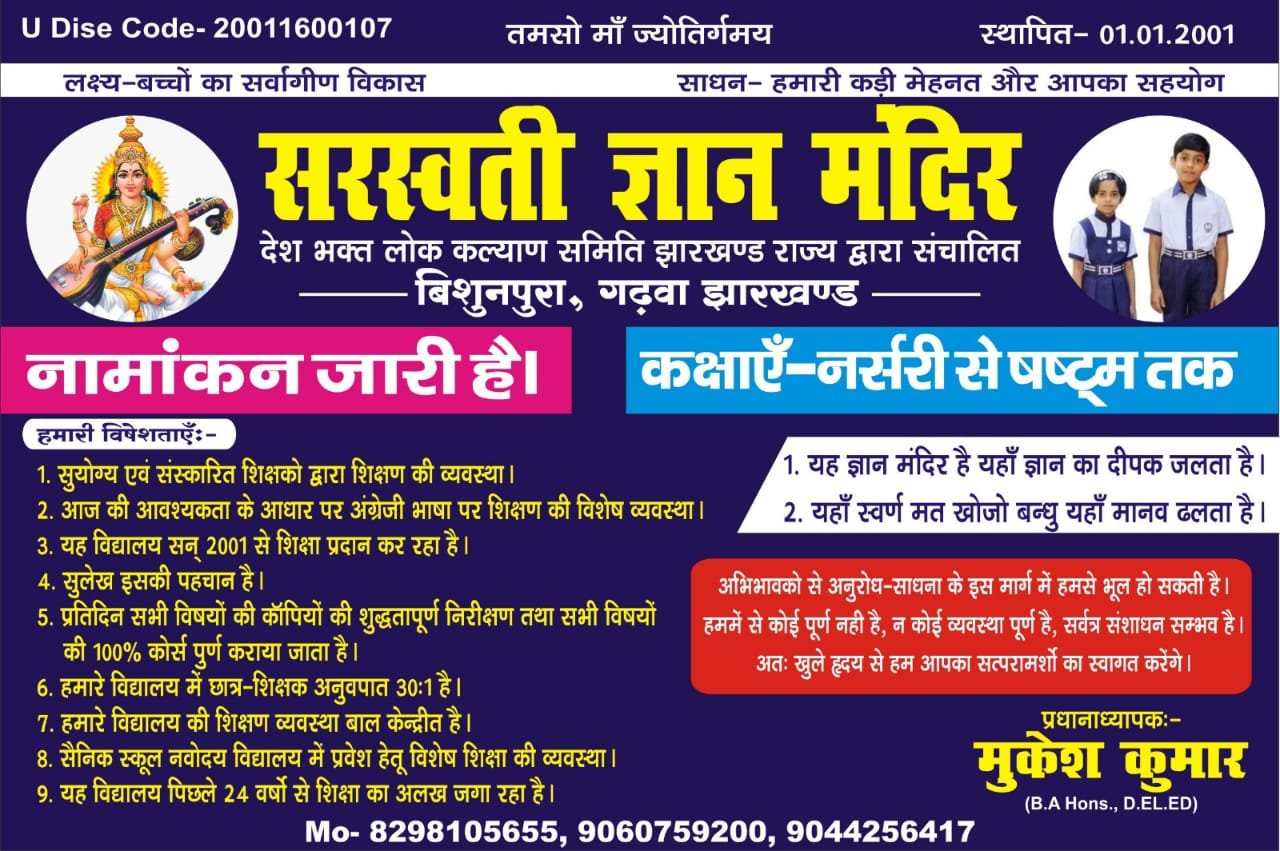 बिशुनपुरा (गढ़वा): गढ़वा जिला के बिशुनपुरा प्रखंड अंतर्गत शंकर मोड़ के समीप विगत 26 वर्षों से संचालित सरस्वती ज्ञान मंदिर विद्यालय में 26वें वार्षिक उत्सव के शुभ अवसर पर निःशुल्क नामांकन कार्यक्रम का आयोजन किया गया। इस पहल का उद्देश्य प्रखंड क्षेत्र में शिक्षा व्यवस्था को और अधिक सशक्त बनाना है।