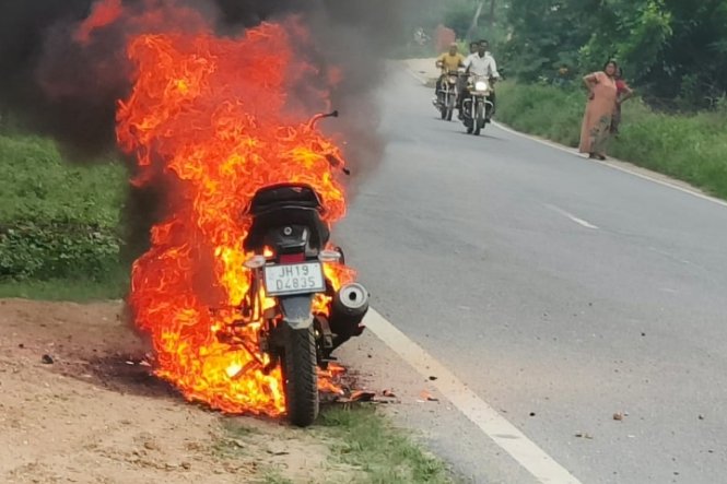 लातेहार: जिले के करकट NH-39 (डालटनगंज-रांची मुख्य सड़क) पर भारुका पेट्रोल पंप के समीप एक बाइक में अचानक आग लग गई। बाइक (टीवीएस राइडर, संख्या JH19D-4835) के चालक अविनाश कुमार यादव ने बताया कि चलते समय बाइक से अचानक धुआं निकलने लगा। उन्होंने तुरंत बाइक को सड़क किनारे खड़ा कर दिया। कुछ ही मिनटों में आग ने विकराल रूप ले लिया और देखते-देखते पूरी गाड़ी जलकर राख हो गई।