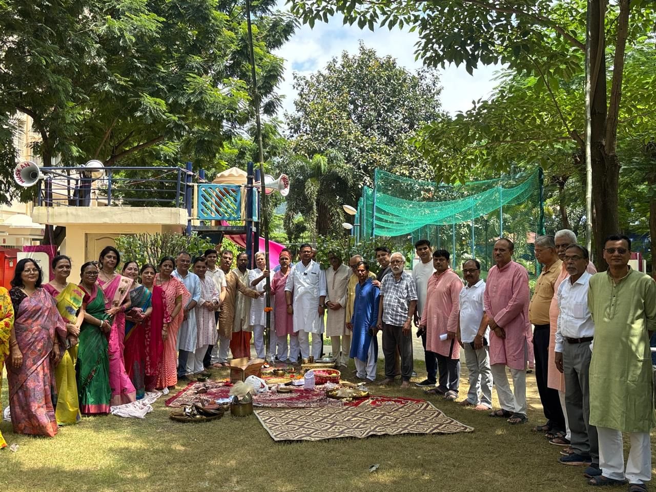 भूमि पूजन के कार्यक्रम में सोसाइटी में रहने वाले सभी महिलाएं और पुरुष उपस्थित थे पूरे विधि विधान से पंडित विश्वनाथ पांडा के द्वारा मंत्र उच्चारण एवं शंख ध्वनि के बीच मां के पंडाल बनाने का कार्य आरंभ हुआ ।
