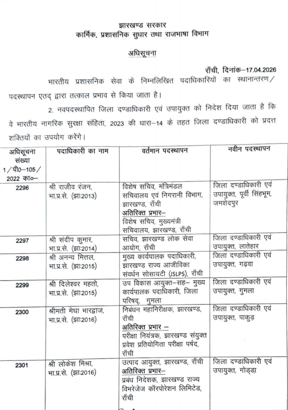 इसके अलावा मेघा भारद्वाज को पाकुड़, लोकेश मिश्रा को गोड्डा, जबकि हजारीबाग के डीसी शशि प्रकाश सिंह को देवघर का नया उपायुक्त बनाया गया है। लातेहार के डीसी उत्कर्ष गुप्ता को कोडरमा भेजा गया है, जबकि हेमंत सती को साहिबगंज से हटाकर हजारीबाग का डीसी बनाया गया है।