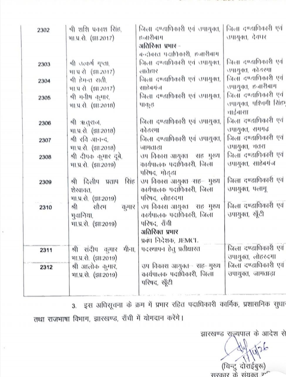 मनीष कुमार को पाकुड़ से हटाकर पश्चिम सिंहभूम का उपायुक्त नियुक्त किया गया है। वहीं ऋतुराज को रामगढ़, रवि आनंद को चतरा, दीपक कुमार दुबे को साहिबगंज और दिलीप प्रताप सिंह को पलामू का डीसी बनाया गया है। सौरभ कुमार भुवानिया को खूंटी, संदीप कुमार मीणा को लोहरदगा और आलोक कुमार को जामताड़ा का उपायुक्त बनाया गया है।
