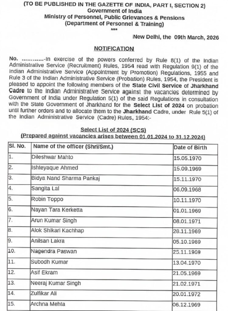रांची: केंद्र सरकार ने झारखंड राज्य प्रशासनिक सेवा (JAS) के 15 अधिकारियों को भारतीय प्रशासनिक सेवा (IAS) में पदोन्नत करने का फैसला किया है। इस संबंध में कार्मिक, लोक शिकायत एवं पेंशन मंत्रालय के अधीन कार्मिक एवं प्रशिक्षण विभाग (DoPT) ने 9 मार्च 2026 को आधिकारिक अधिसूचना जारी की है।