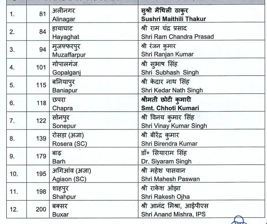 बीजेपी ने पहली सूची में कुल 71 कैंडिडेट का ऐलान किया था. पार्टी ने आज 12 उम्मीदवारों के नाम की घोषणा कर दी है. इस तरह बीजेपी ने अबतक कुल 83 कैंडिडेट के नाम का ऐलान कर दिया है. एनडीए में हुए समझौते के तहत बीजेपी राज्य की 243 विधानसभा सीटों में से कुल 101 पर चुनाव लड़ रही है. जेडीयू भी 101 सीटों पर चुनाव लड़ रही है.
