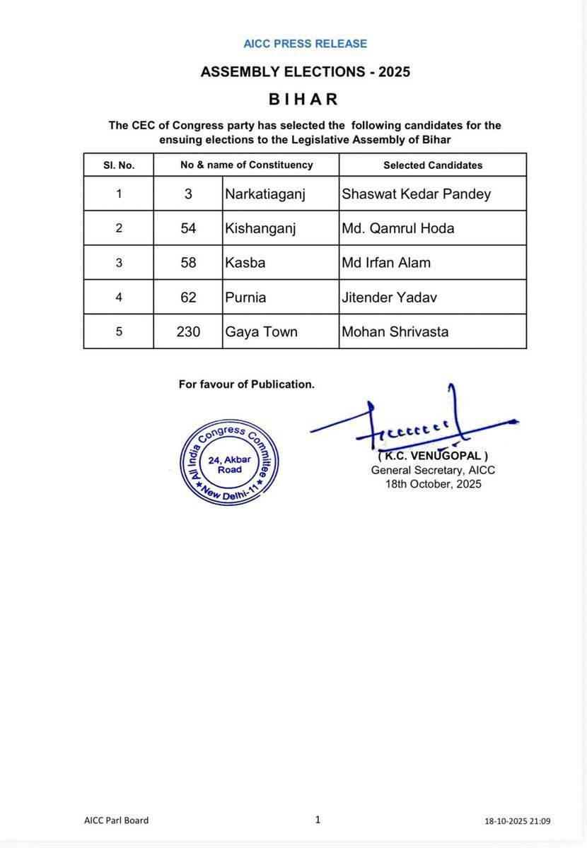 नरकटियागंज से सास्वत केदार पांडेय, किशनगंज से कमरूल हुदा, कस्बा से इरफ़ान आलम, पूर्णिया से जितेंद्र यादव और गया टाउन से मोहन श्रीवास्तव को प्रत्याशी बनाया है। बता दें कि पहली सूची में कांग्रेस ने 48 उम्मीदवारों का ऐलान किया था।