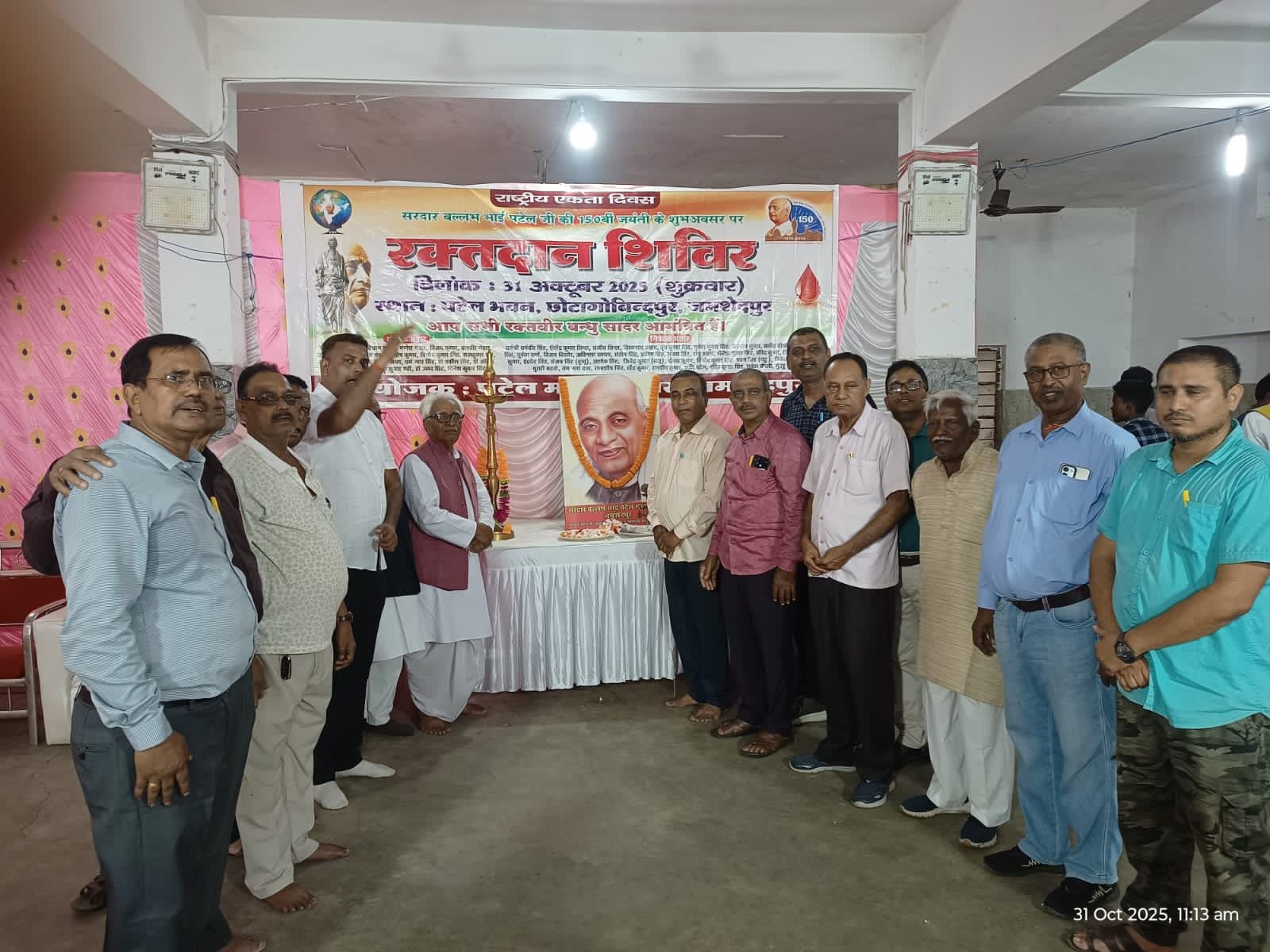 जमशेदपुर : इस लौहनगरी में लौह पुरुष सरदार वल्लभ भाई पटेल की 150 वीं जयंती में पटेल महापरिवार की ओर से छोटा गोविंदपुर स्थित पटेल भवन में रक्तदान शिविर लगाई गई। इस दौरान सरदार पटेल के चित्र पर पुष्प अर्पित कर उन्हें श्रद्धांजलि दी गई।