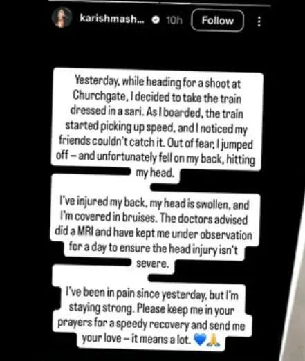 करिश्मा शर्मा ने इंस्टाग्राम पर स्टोरी शेयर करते हुए लिखा कि कल मैं चर्चगेट में एक शूटिंग के लिए जा रही थी. उस दौरान मैंने साड़ी पहनी हुई थी. जैसी ही ट्रेन में चढ़ी, ट्रेन की स्पीड़ बढ़ने लगी और मैंने देखा कि मेरे दोस्त उसे पकड़ नहीं पा रहे हैं. डर के मारे मैं कूद गई और मैं पीठ के बल गिर गई. इस वजह से मेरे सिर में काफी चोट आई हैं.