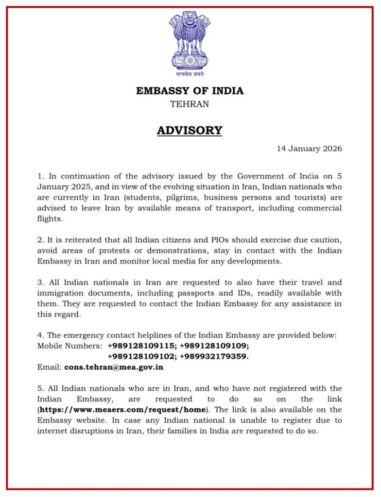 एडवाइजरी में कहा गया है कि भारतीय नागरिक और PIO (भारतीय मूल के व्यक्ति) अत्यधिक सतर्कता बरतें, किसी भी विरोध प्रदर्शन या अशांत इलाकों से दूर रहें और दूतावास के संपर्क में बने रहें। साथ ही स्थानीय मीडिया पर नजर रखने की भी अपील की गई है।