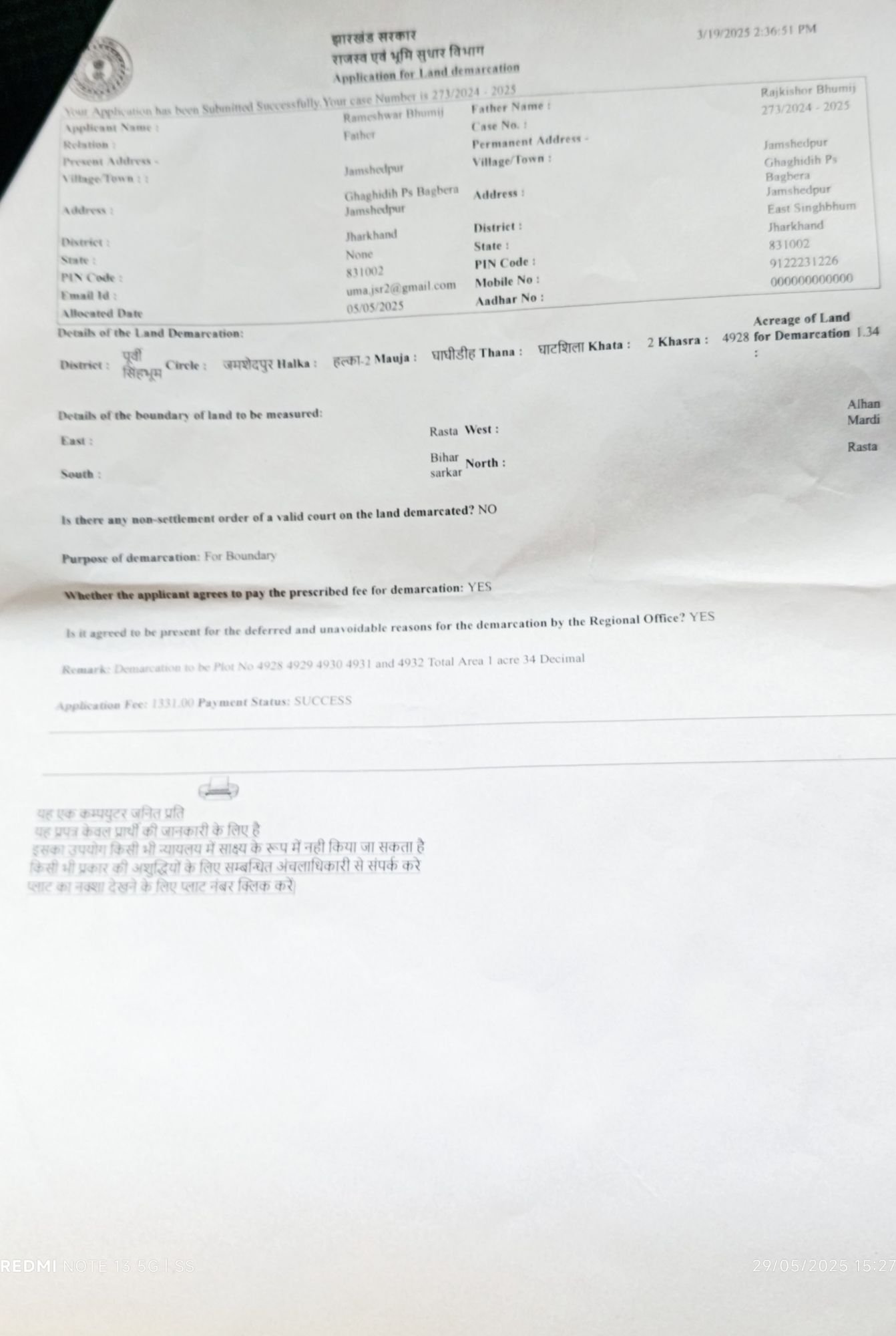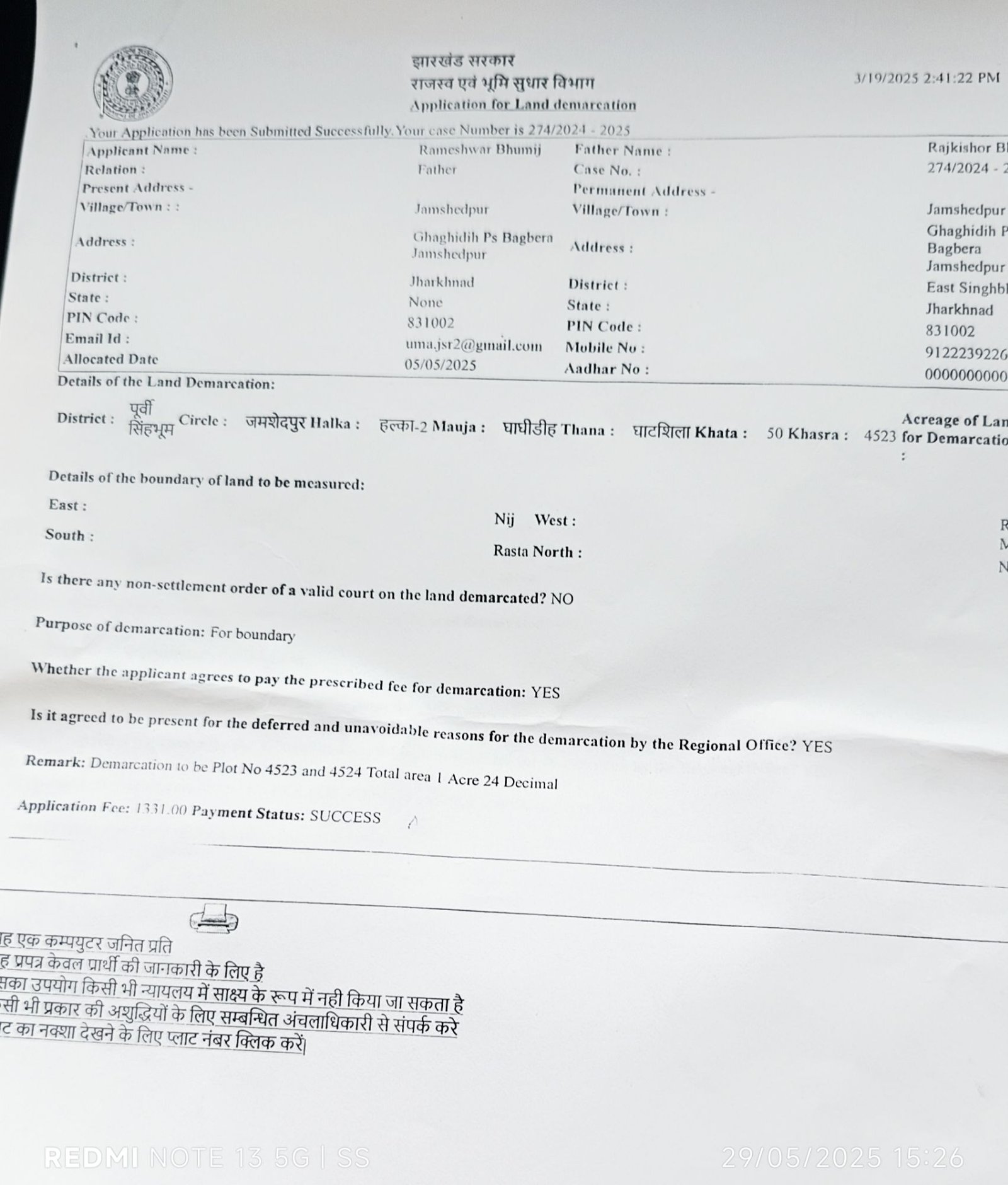 उनके आवेदन के आलोक में अंचलाधिकारी जमशेदपुर ने 14 मई 2025 को भूमि सीमांकन प्रारंभ कराने हेतू तिथि निर्धारित किया था।