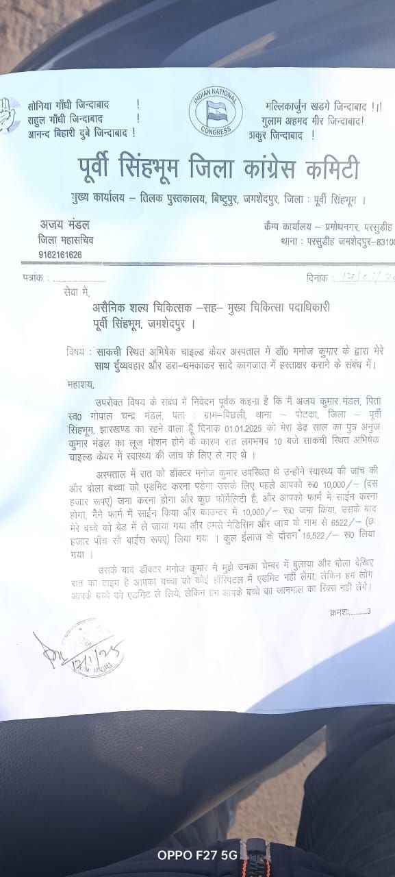अभिषेक चाइल्ड केयर डॉ० मनोज कुमार पर कांग्रेसी अजय मंडल का गंभीर आरोप,पैसा ऐंठा, बच्चा का इलाज नहीं,TMH में बची जान
