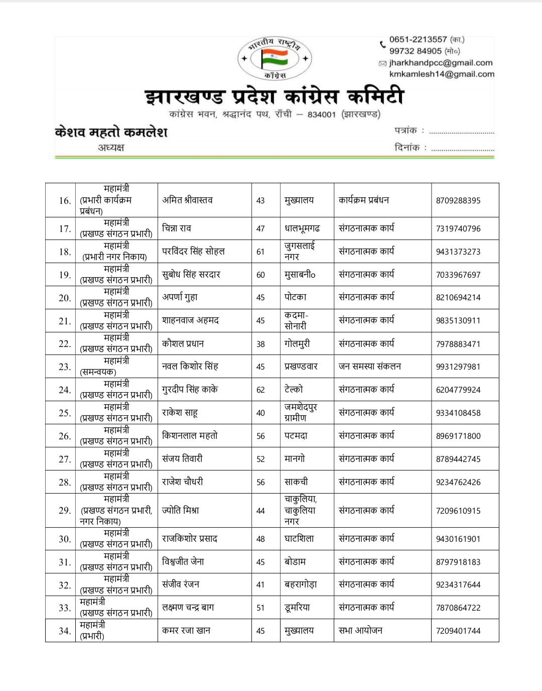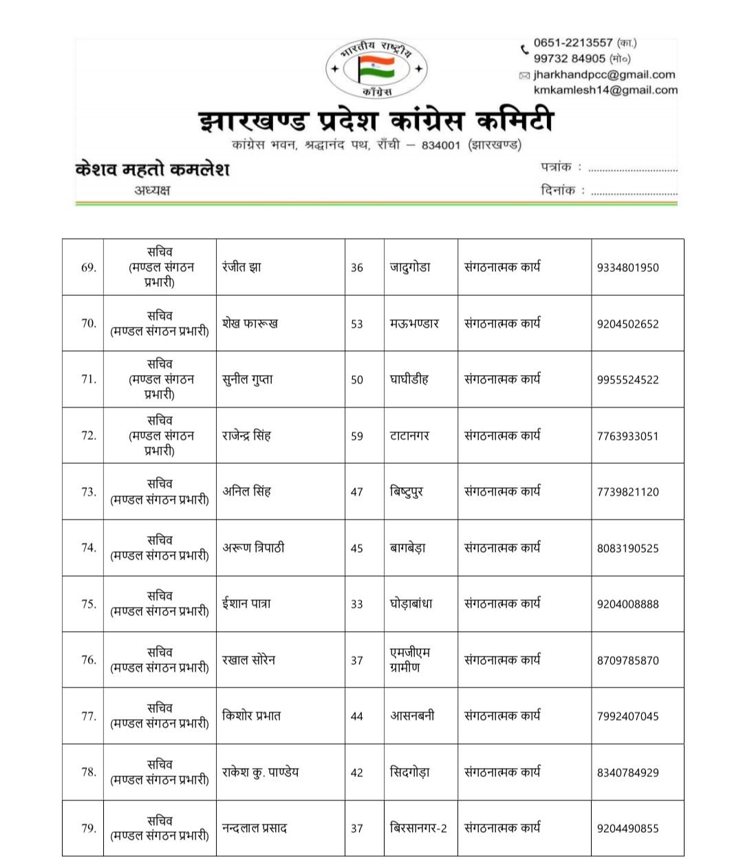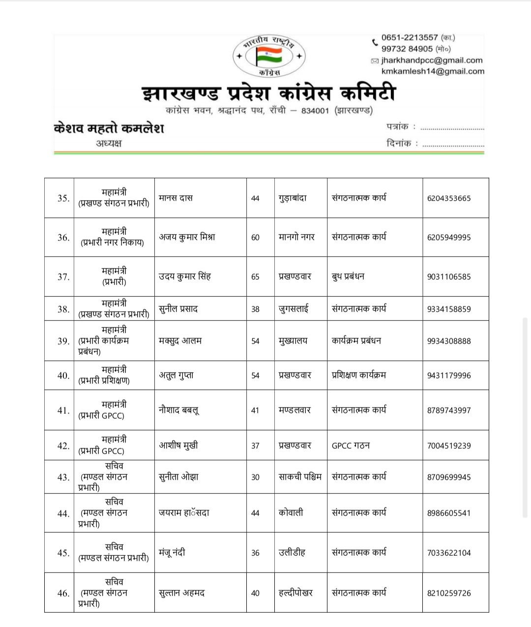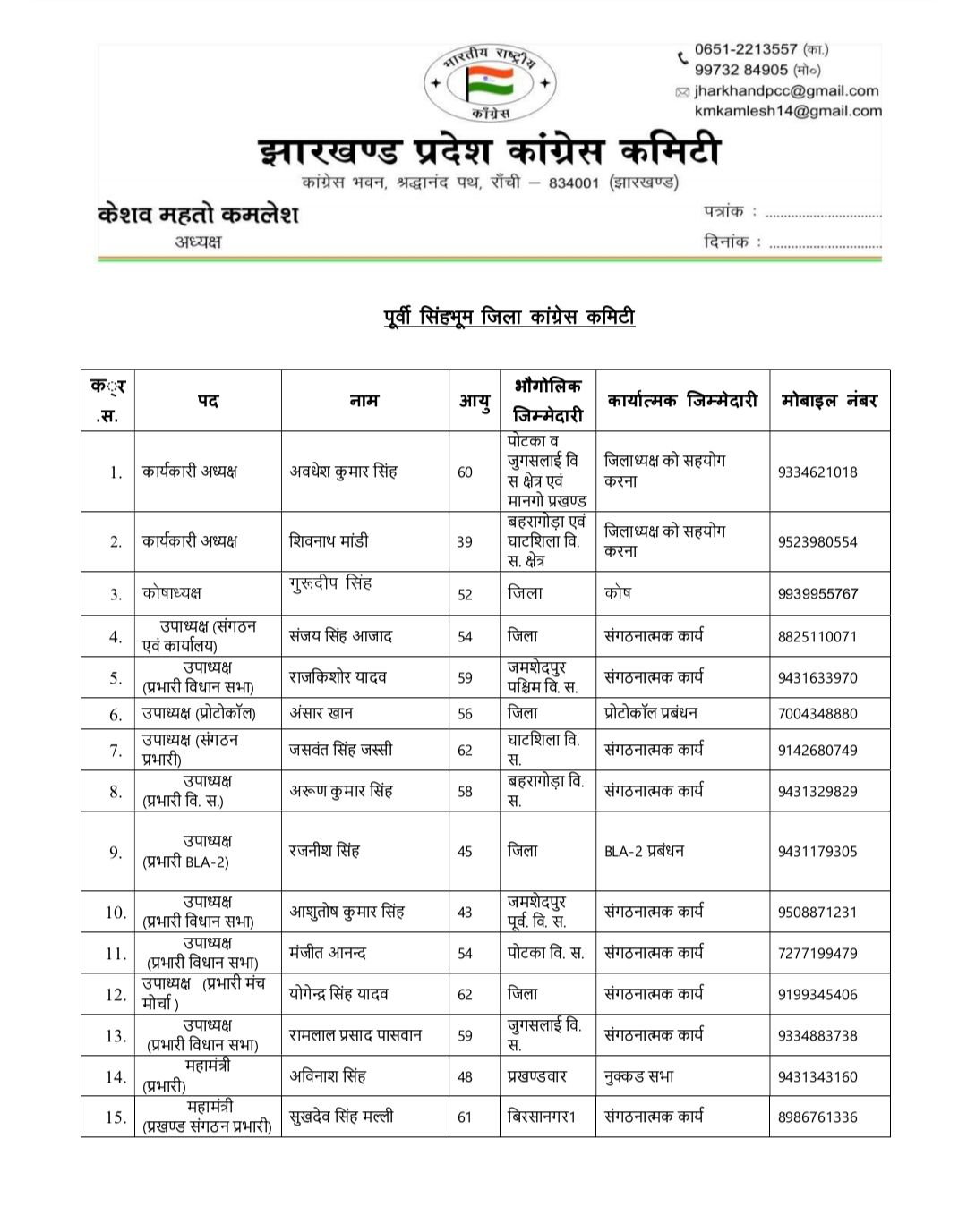 जमशेदपुर : संगठन सृजन अभियान के तहत झारखण्ड प्रदेश कांग्रेस कमिटी के अध्यक्ष श्री केशव महतो कमलेश ने पूर्वी सिंहभूम जिला कांग्रेस कमिटी का गठन तत्काल प्रभाव से गठन कर दिया है। प्रदेश अध्यक्ष श्री केशव महतो कमलेश ने जिला कमिटी को स्वीकृत करते हुए जिला कमिटी की सूची जिला अध्यक्ष परविंदर सिंह को उपलब्ध करा दी है। जिलाध्यक्ष परविंदर सिंह ने नवगठित जिला कमिटी, प्रेस को जारी करते हुए कहा कि प्रदेश प्रभारी श्री के राजू, प्रदेश सह प्रभारी श्री भूपेंद्र मरावी के द्वारा पदों के निर्धारित मापदंडों के तहत सभी नव नियुक्त पदाधिकारियों को पद के साथ प्रभार, कार्य क्षेत्र एवं दायित्वों के साथ संगठनात्मक कार्य सौंपा है। सभी पदाधिकारी को इमानदारी के साथ संगठनात्मक जिम्मेदारी का निर्वहन पूर्ण करते हुए जिला कार्यालय में प्रतिवेदन समय अवधि में समर्पित करना अनिवार्य होगा। जिलाध्यक्ष परविंदर सिंह ने सभी नवनियुक्त जिला पदाधिकारियों को बधाई देते हुए सफल दायित्व निर्वहन का कामना किया है। साथ ही जिलाध्यक्ष परविंदर सिंह ने यह भी कहा है कि जो भी सक्रिय कार्यकर्ता पद से वंचित रह गए है। उन्हें जल्द ही अग्रणी संगठन विभाग, मंच मोर्चा में जगह प्रदान कर पार्टी के लिए कार्य करने का अवसर दी जाएगी।