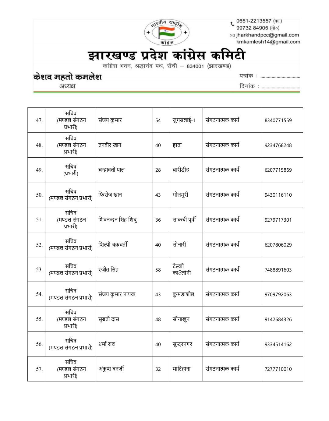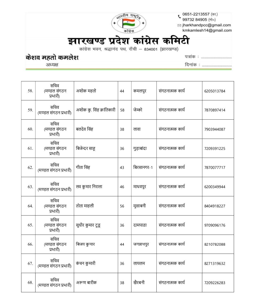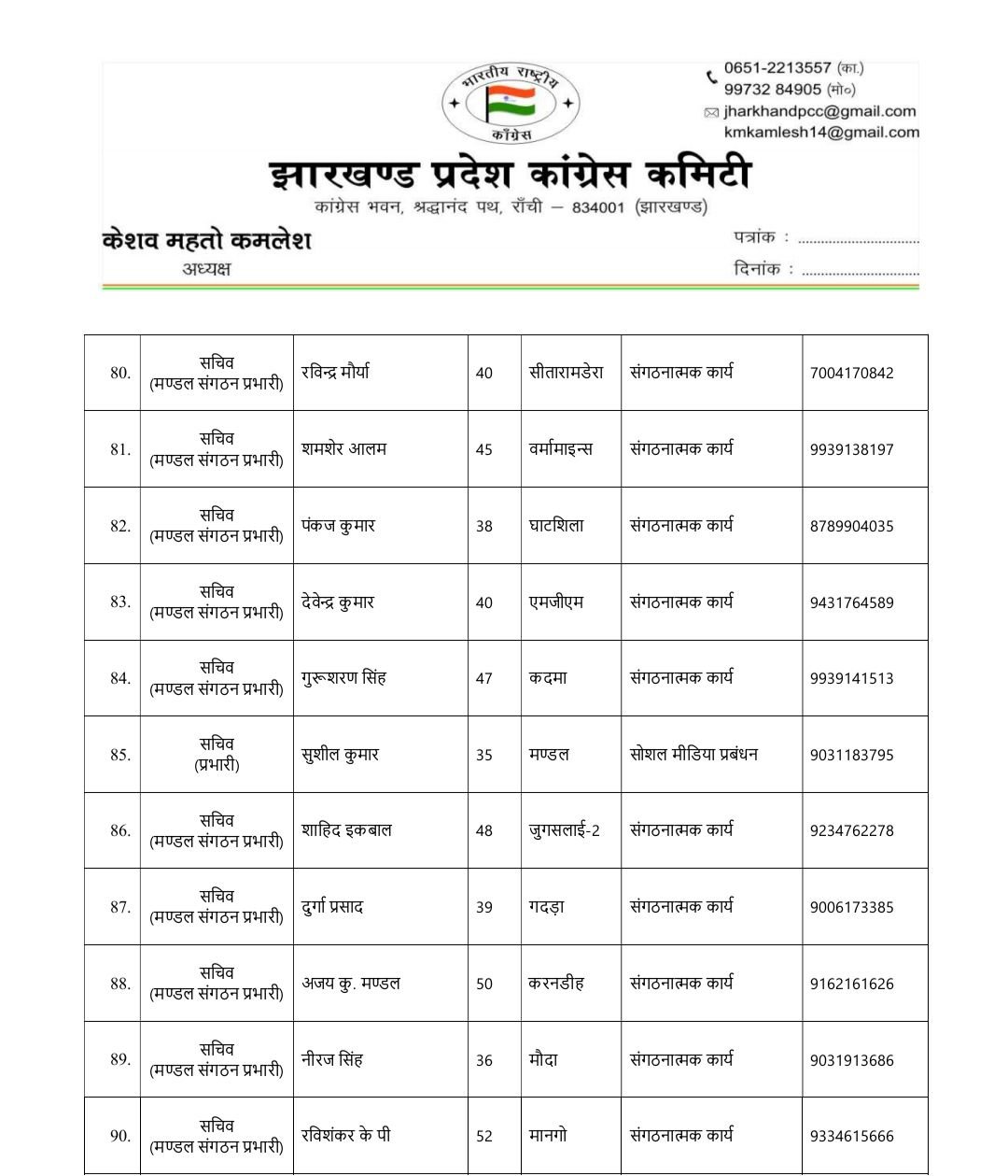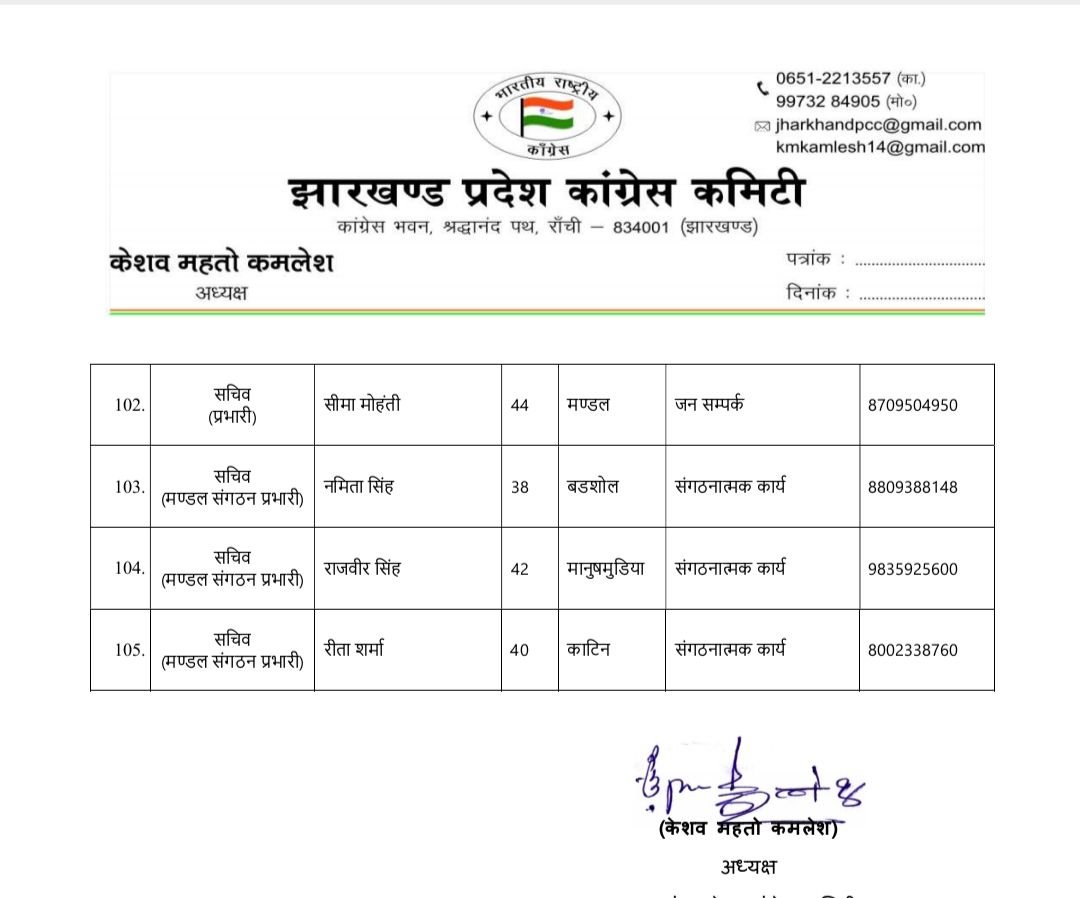 जमशेदपुर : संगठन सृजन अभियान के तहत झारखण्ड प्रदेश कांग्रेस कमिटी के अध्यक्ष श्री केशव महतो कमलेश ने पूर्वी सिंहभूम जिला कांग्रेस कमिटी का गठन तत्काल प्रभाव से गठन कर दिया है। प्रदेश अध्यक्ष श्री केशव महतो कमलेश ने जिला कमिटी को स्वीकृत करते हुए जिला कमिटी की सूची जिला अध्यक्ष परविंदर सिंह को उपलब्ध करा दी है। जिलाध्यक्ष परविंदर सिंह ने नवगठित जिला कमिटी, प्रेस को जारी करते हुए कहा कि प्रदेश प्रभारी श्री के राजू, प्रदेश सह प्रभारी श्री भूपेंद्र मरावी के द्वारा पदों के निर्धारित मापदंडों के तहत सभी नव नियुक्त पदाधिकारियों को पद के साथ प्रभार, कार्य क्षेत्र एवं दायित्वों के साथ संगठनात्मक कार्य सौंपा है। सभी पदाधिकारी को इमानदारी के साथ संगठनात्मक जिम्मेदारी का निर्वहन पूर्ण करते हुए जिला कार्यालय में प्रतिवेदन समय अवधि में समर्पित करना अनिवार्य होगा। जिलाध्यक्ष परविंदर सिंह ने सभी नवनियुक्त जिला पदाधिकारियों को बधाई देते हुए सफल दायित्व निर्वहन का कामना किया है। साथ ही जिलाध्यक्ष परविंदर सिंह ने यह भी कहा है कि जो भी सक्रिय कार्यकर्ता पद से वंचित रह गए है। उन्हें जल्द ही अग्रणी संगठन विभाग, मंच मोर्चा में जगह प्रदान कर पार्टी के लिए कार्य करने का अवसर दी जाएगी।