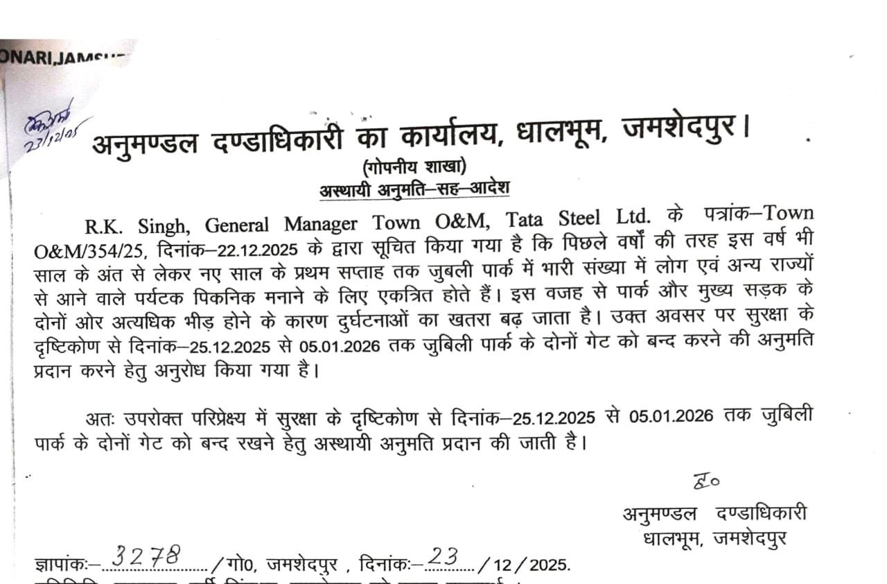 पिछले वर्षों की तरह इस वर्ष भी साल के अंत से लेकर नए साल के प्रथम सप्ताह तक जुबली पार्क में भारी संख्या में लोगों एवं अन्य राज्यों से आने वाले पर्यटक पिकनिक मनाने के लिए एकत्रित होते हैं। इस वजह से पार्क और मुख्य सड़क के दोनों ओर अत्यधिक भीड़ होने के कारण दुर्घटनाओं का खतरा बढ़ जाता है। उक्त अवसर पर सुरक्षा के दृष्टिकोण से दिनांक-25.12.2025 से 05.01.2026 तक जुबिली पार्क के दोनों गेट को बन्द करने की अनुमति प्रदान करने हेतु अनुरोध टाटा स्टील नगर प्रबंधन के द्वारा धालभूमगढ़ अनुमंडल अधिकारी कार्यालय से किया गया था।