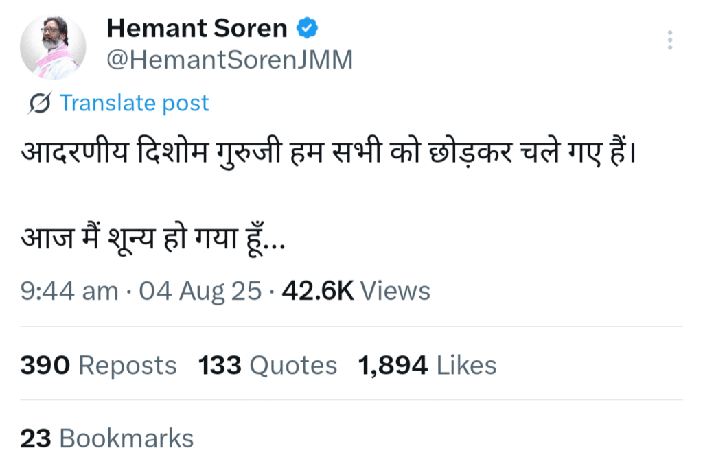 मुख्यमंत्री हेमंत सोरेन ने पिता के निधन की जानकारी एक्स पर दी।