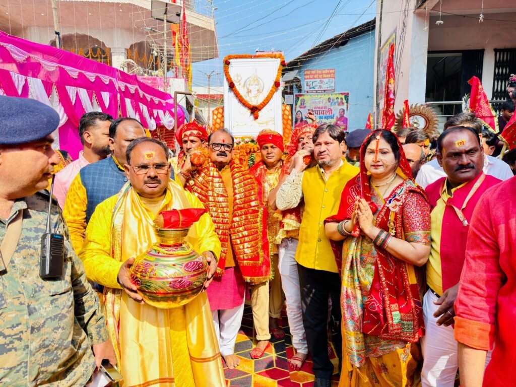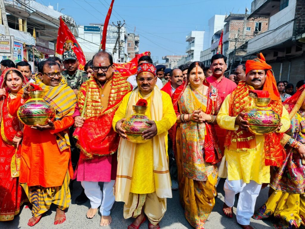 गढ़वा: शहर के गढ़देवी मंदिर परिसर में प्रथम तल पर श्री अर्धनारीश्वर महादेव की प्राण-प्रतिष्ठा की जा रही है। आयोजित यह तीन दिवसीय प्राण प्रतिष्ठा अनुष्ठान सोमवार से प्रारंभ हो गया। प्रथम दिन 19 जनवरी को जलयात्रा सह नगर भ्रमण के साथ प्राण-प्रतिष्ठा समारोह की शुरूआत की गई। समारोह में झारखंड सरकार के पूर्व मंत्री झामुमो के केंद्रीय महासचिव मिथिलेश कुमार ठाकुर शामिल हुए। मंदिर परिसर में पूजा अर्चना के बाद कलश यात्रा प्रारंभ हुई। पूर्व मंत्री श्री ठाकुर ने उपवास रखकर एवं नंगे पांव श्री अर्धनारीश्वर महादेव की पालकी कंधे पर उठाकर नगर भ्रमण कराया। मां गढ़देवी के पुजारी राजन पांडेय एवं आचार्य आशीष वैद्य ने पूजा अर्चना कराया।