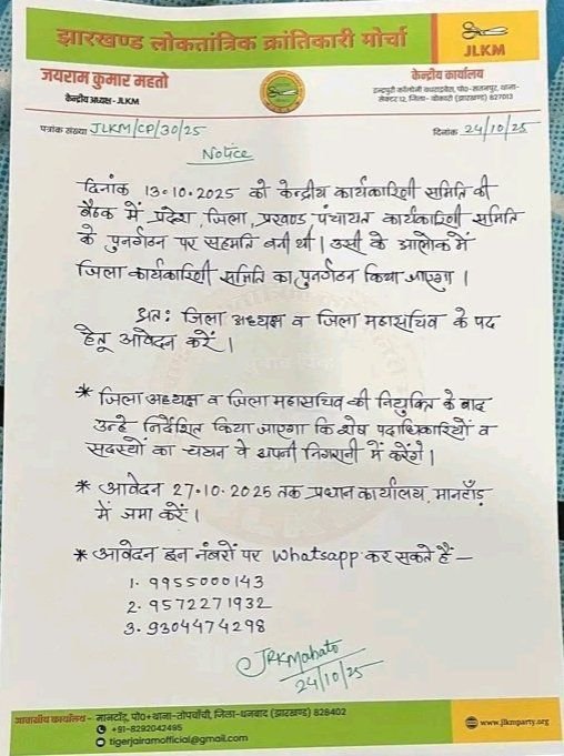 पार्टी के केंद्रीय अध्यक्ष जयराम महतो ने पर्यवेक्षक, प्रभारी, सह प्रभारी, संयोजक और स्टार प्रचारकों की जिम्मेदारियां तय की हैं.