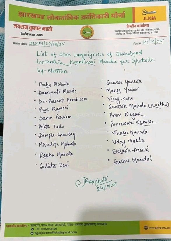 जमशेदपुर:झारखंड लोकतांत्रिक क्रांतिकारी मोर्चा ने घाटशिला विधानसभा उपचुनाव के लिए स्टार प्रचारकों की सूची जारी कर दी है।इसके लिए टीम का भी गठन किया गया है।