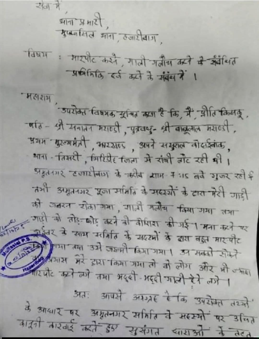 प्रोति किसकू, पति – श्री सनातन मराण्डी, पुत्रवधु- श्री बाबूलाल मराण्डी, म मुख्यमंत्री, भारखण्ड, अपने ससुराल कोदाईव थाना – तिसरी, गिरिडीह जिला से रांची लौट रही थी।अमृतनगर हजारीबाग के करीब शाम 7:15 बजे गुजर रही तभी अमृतनगर पूजा समिति के सदस्यों के द्वारा उनकी गाड़ी को जबरन रोका गया, गाली गलौज किया गया। गाड़ी को तोड़-फोड़ करने की कोशिश की गई । मना करने पर ड्राईवर के साथ समिति के सदस्यों के द्वारा बहुत मारपीट गया तथा उसे जख्मी किया गया। उन सबको रोकने की कोशिश करने पर उनके साथ बदतमीजी और गाली गलौज की गई।