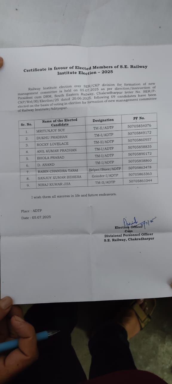 एस.ई रेलवे आदित्यपुर रेलवे इंस्टीट्यूट चुनाव में रेलवे मेंस कांग्रेस के 9 उम्मीदवार बाहरी वोट से विजेता