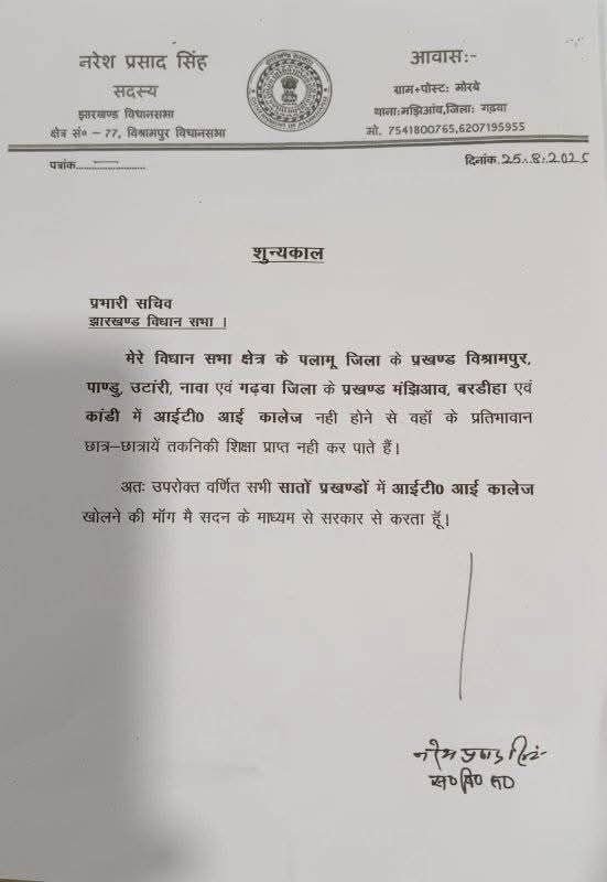 पलामू: विश्रामपुर विधानसभा क्षेत्र से विधायक नरेश प्रसाद सिंह ने विधानसभा के शून्यकाल में मांग रखी कि क्षेत्र के सात प्रखंडों—पलामू जिले के विश्रामपुर, पांडू, ऊंटारी, नावाबाजार तथा गढ़वा जिले के मझिआव, बरडीहा और कांडी में आईटीआई कॉलेज खोले जाएं।