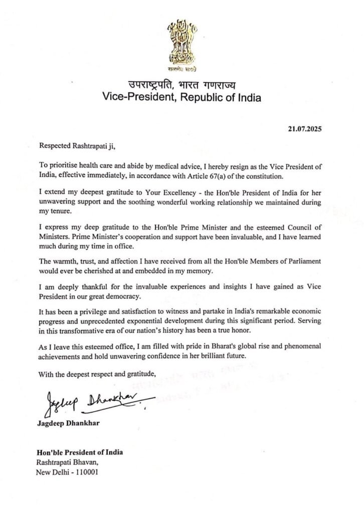 जगदीप धनखड़ ने लेटर में लिखा, “मैं प्रधानमंत्री और उनकी सम्मानित मंत्रिपरिषद के प्रति अपनी गहरी कृतज्ञता व्यक्त करता हूं। प्रधानमंत्री का सहयोग और समर्थन अमूल्य रहा है, और मैंने अपने कार्यकाल के दौरान उनसे बहुत कुछ सीखा है। सभी माननीय संसद सदस्यों से मुझे जो गर्मजोशी, विश्वास और स्नेह मिला है, वह सदैव मेरी स्मृति में रहेगा। मैं हमारे महान लोकतंत्र में उपराष्ट्रपति के रूप में प्राप्त अमूल्य अनुभवों और अंतर्दृष्टि के लिए बहुत आभारी हूं। इस महत्वपूर्ण अवधि के दौरान भारत की उल्लेखनीय आर्थिक प्रगति और अभूतपूर्व घातीय विकास को देखना और उसमें भाग लेना मेरे लिए सौभाग्य और संतोष की बात रही है। हमारे राष्ट्र के इतिहास के इस परिवर्तनकारी युग में सेवा करना मेरे लिए एक सच्चा सम्मान रहा है। इस प्रतिष्ठित पद को छोड़ते हुए, मैं भारत की वैश्विक उन्नति और अभूतपूर्व उपलब्धियों पर गर्व महसूस कर रहा हूं तथा उसके उज्ज्वल भविष्य के प्रति अटूट विश्वास रखता हूं।”