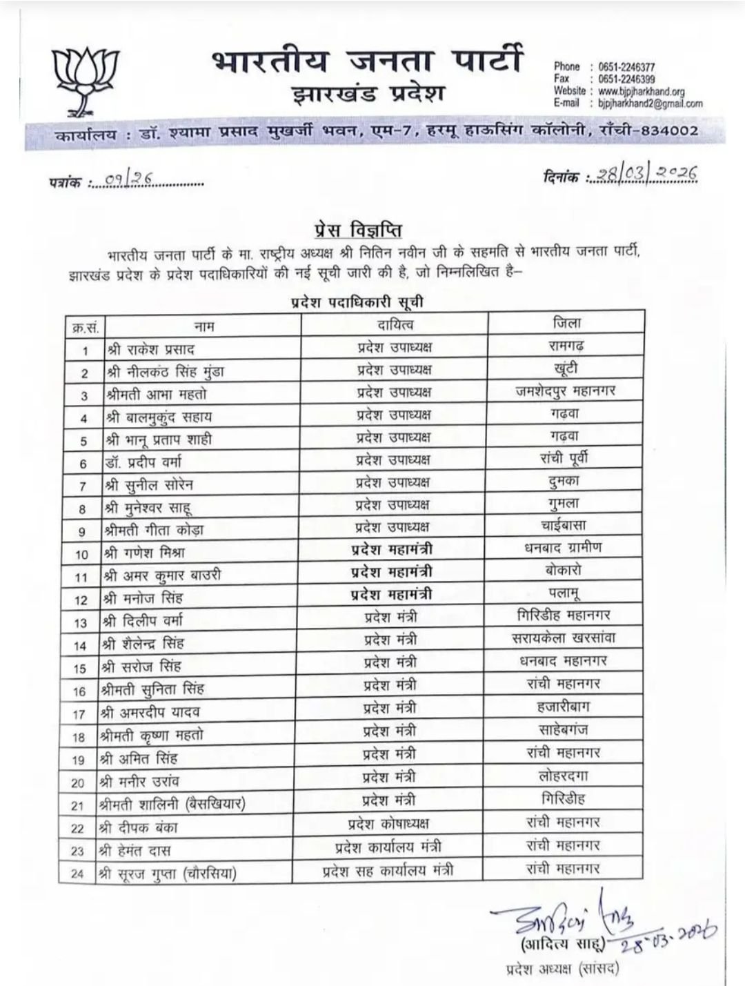 रांचीः भारतीय जनता पार्टी झारखंड प्रदेश अध्यक्ष आदित्य साहू ने पार्टी के राष्ट्रीय अध्यक्ष नितिन नबीन की सहमति से झारखंड बीजेपी के प्रदेश पदाधिकारियों की नई सूची जारी कर दी गई है। प्रदेश भाजपा अध्यक्ष आदित्य साहू की कमेटी में 9 उपाध्यक्ष और तीन महासचिव शामिल हैं।