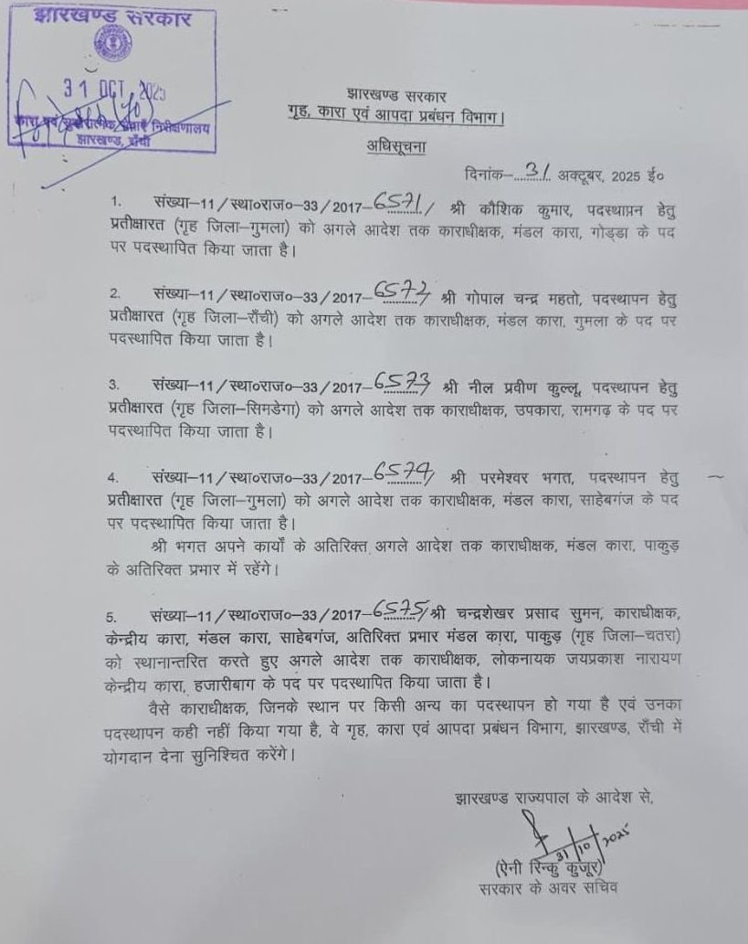 अधिसूचना गृह, कारा एवं आपदा प्रबंधन विभाग की ओर से जारी आदेश के अनुसार, कौशिक कुमार को मंडल कारा, गोड्डा का काराधीक्षक बनाया गया है, जबकि गोपाल चंद्र महतो को मंडल कारा, गुमला का दायित्व सौंपा गया है। नील प्रवीण कुल्लू को उपकारा, रामगढ़ में पदस्थापित किया गया है। परमेश्वर भगत को मंडल कारा, साहेबगंज का काराधीक्षक बनाया गया है और उन्हें मंडल कारा, पाकुड़ का अतिरिक्त प्रभार भी दिया गया है।