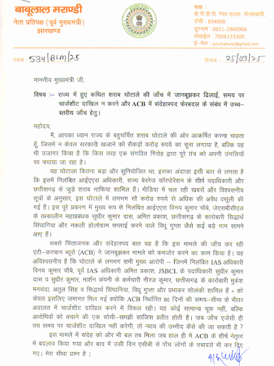 शराब घोटाले की जांच करने वाली ACB की भूमिका भी सवालों के घेरे में खड़ा किया है। मरांडी ने कहा कि चार्जशीट समय पर दाखिल न करने की वजह से मुख्य आरोपित आसानी से अदालत से जमानत पा गए। इसके पीछे की मंशा स्पष्ट है,आरोपितों को बचाना।