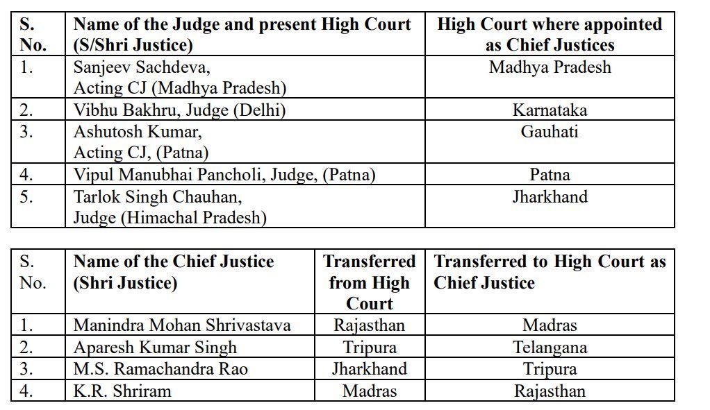 रांची: भारत की राष्ट्रपति द्रौपदी मुर्मु ने उच्च न्यायालयों में मुख्य न्यायाधीशों की नई नियुक्तियों को स्वीकृति दे दी है। केंद्र सरकार की ओर से जारी अधिसूचना के अनुसार, हिमाचल प्रदेश हाईकोर्ट के जस्टिस तरलोक सिंह चौहान को झारखंड हाईकोर्ट का नया चीफ जस्टिस बनाया गया है। झारखंड हाईकोर्ट के चीफ जस्टिस एमएस रामाराव को त्रिपुरा हाईकोर्ट का चीफ जस्टिस बनाया गया है। पटना हाई कोर्ट के कार्यकारी मुख्य न्यायाधीश आशुतोष कुमार को गुवाहाटी हाई कोर्ट का मुख्य न्यायाधीश बनाया गया है। वहीं, पटना हाई कोर्ट के वरिष्ठ न्यायाधीश विपुल एम. पंचोली को अब पटना हाई कोर्ट का मुख्य न्यायाधीश नियुक्त किया गया है। पटना हाई कोर्ट से पहले पंजाब एवं हरियाणा हाई कोर्ट में स्थानांतरित किए गए न्यायाधीश सुधीर सिंह को फिर से पटना हाई कोर्ट में स्थानांतरित किया गया है।