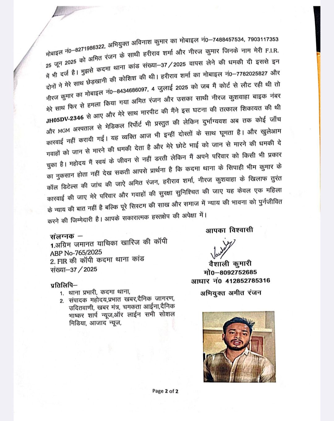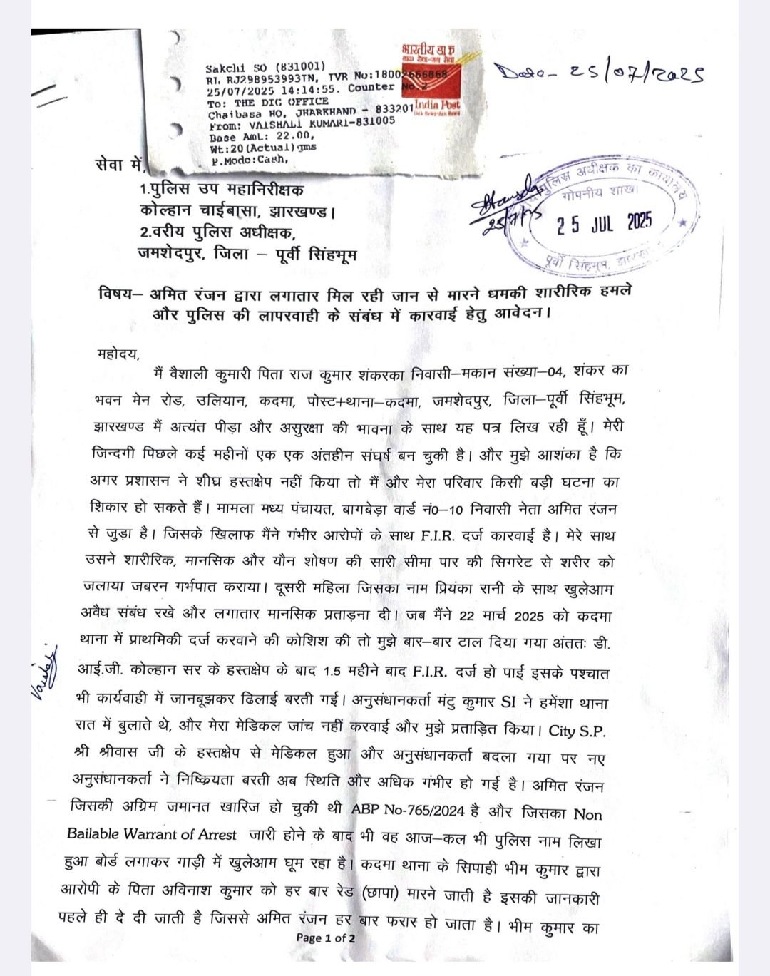 वैशाली कुमारी, जो कदमा थाना क्षेत्र की निवासी हैं, ने एक विस्तृत पत्र के माध्यम से कहा है कि उन्होंने 22 मार्च 2025 को कदमा थाना में एफआईआर दर्ज कराने की कोशिश की थी लेकिन पुलिस की लापरवाही के कारण उन्हें करीब डेढ़ महीने तक इंतजार करना पड़ा। अंततः कोल्हान डीआईजी के हस्तक्षेप के बाद 1.5 महीने की देरी से एफआईआर दर्ज हो सकी। मामला कदमा थाना कांड संख्या-37/2025 के रूप में दर्ज है।
