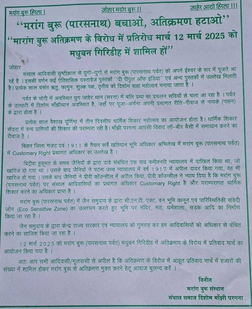 आदिवासी समाज ने आरोप लगाया है कि जैन समुदाय ने आदिवासियों के धार्मिक स्थल मरांग बुरू युग जाहेर थान में अतिक्रमण किया है।