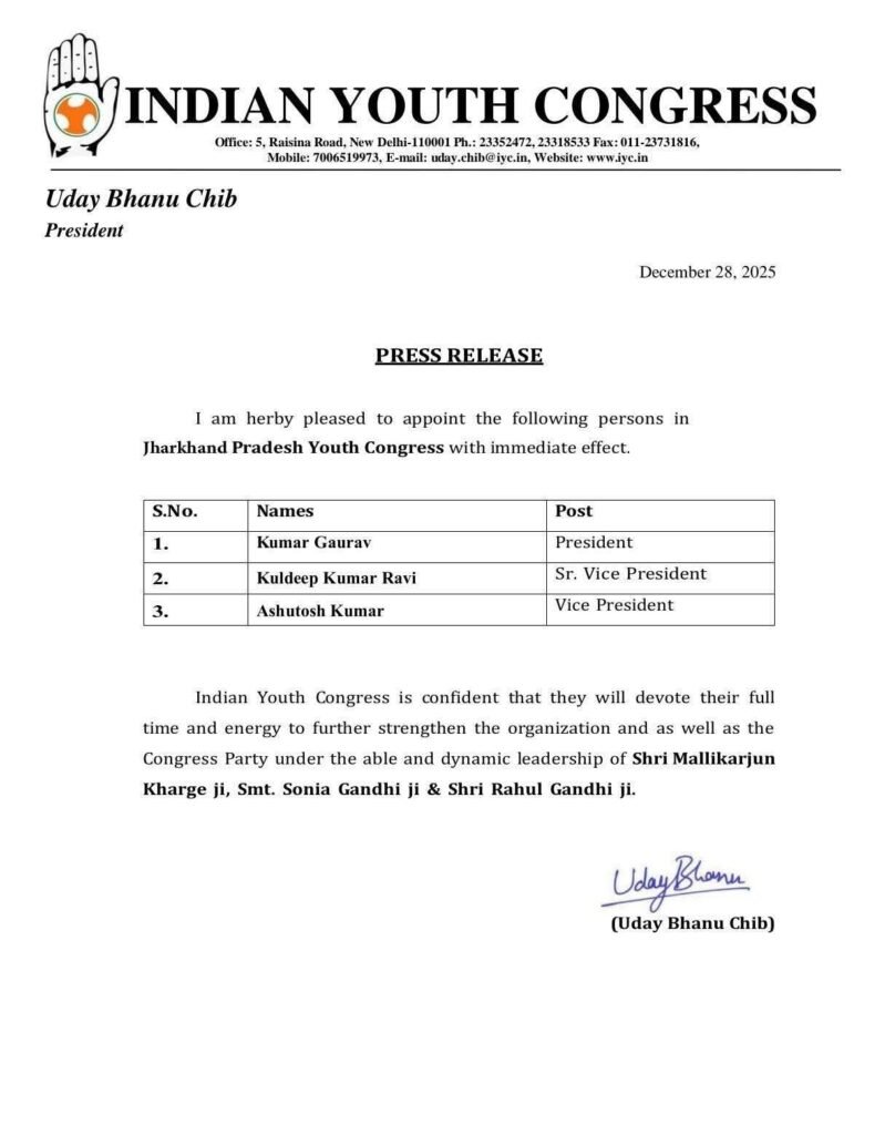 गौरतलब है कि झारखंड यूथ कांग्रेस कमेटी में पदाधिकारियों की घोषणा को लेकर पहले ही संकेत दिए जा चुके थे। संगठन के भीतर यह चर्चा तेज थी कि जल्द ही नई टीम की औपचारिक घोषणा होगी, जो अब पूरी हो चुकी है। माना जा रहा है कि यह नई कार्यकारिणी आगामी राजनीतिक चुनौतियों और संगठनात्मक विस्तार को ध्यान में रखकर गठित की गई है।