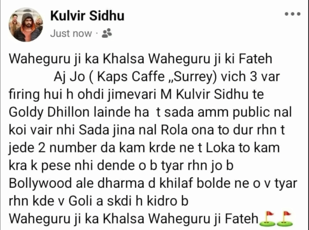 “वाहेगुरु जी का खालसा, वाहेगुरु जी की फतेह। आज सरे में Kaps Cafe पर हुई तीसरी फायरिंग की जिम्मेदारी मैं, कुलवीर सिद्धू और गोल्डी ढिल्लों लेते हैं। हमारा आम जनता से कोई दुश्मनी नहीं है, केवल उन लोगों से है जो अवैध काम करते हैं या धर्म के खिलाफ बोलते हैं। गोली कहीं से भी आ सकती है।”