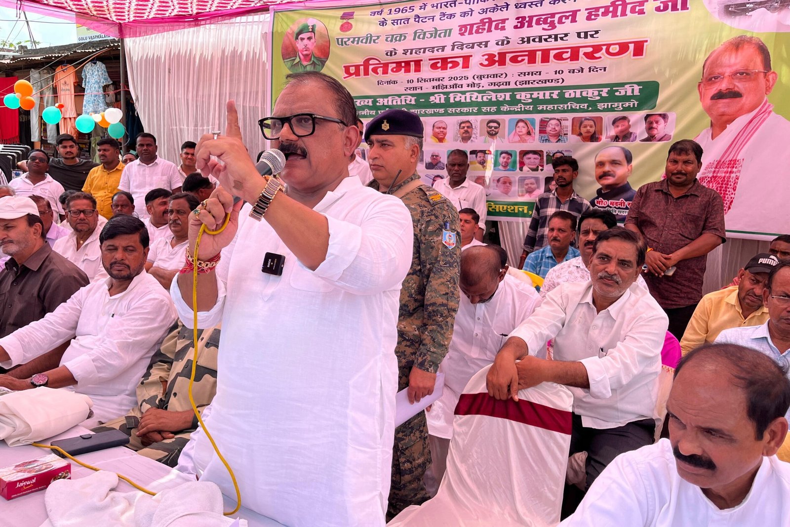 गढ़वा: वीर शहीद अब्दुल हमीद की शहादत दिवस के मौके पर बुधवार को शहर के मझिआंव मोड़ पर प्रतिमा का अनावरण किया गया। झारखंड सरकार के पूर्व मंत्री, झामुमो के केंद्रीय महासचिव मिथिलेश ठाकुर ने परमवीर चक्र विजेता वीर शहीद अब्दुल हमीद की प्रतिमा का अनावरण किया।