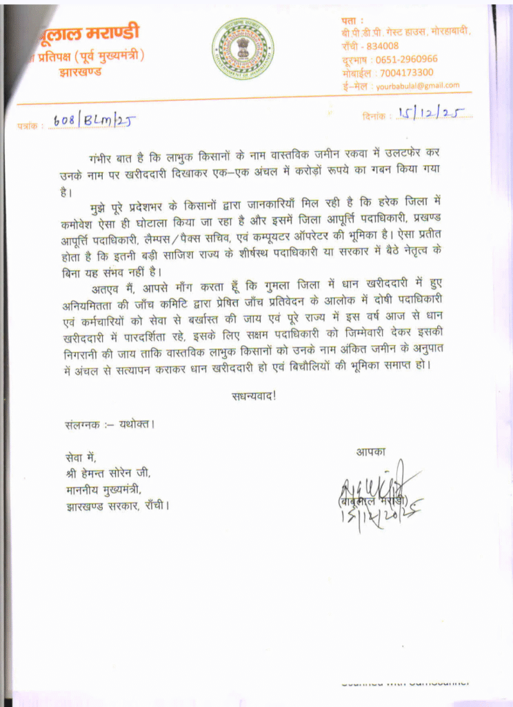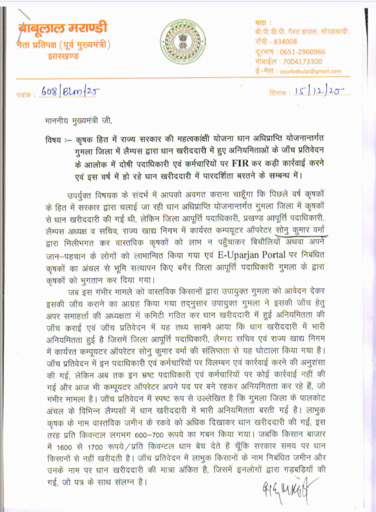 बाबूलाल मरांडी ने पत्र में स्पष्ट शब्दों में कहा है कि, इतने बड़े पैमाने पर धान खरीद में गड़बड़ी किसी शीर्षस्थ पदाधिकारी या सरकार के नेतृत्व की जानकारी के बिना संभव नहीं लगती।