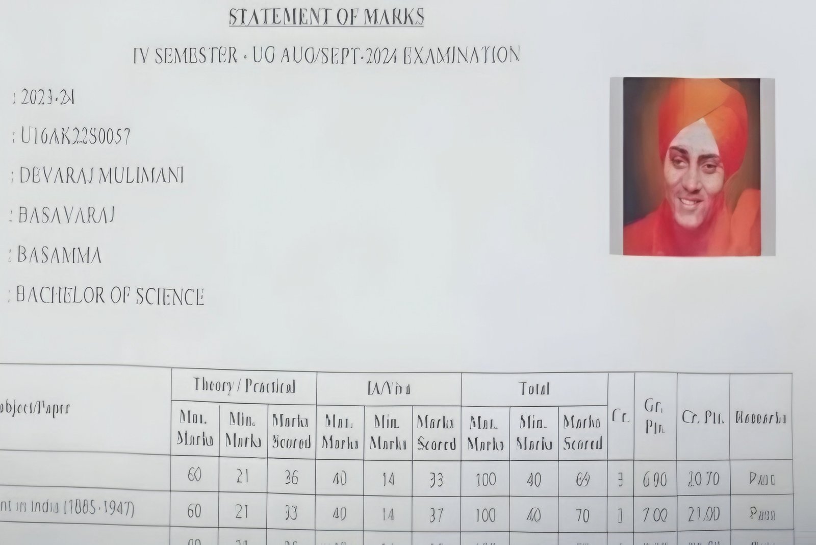 कोप्पल: कर्नाटक के कोप्पल में स्थित विजयनगर श्री कृष्णदेवराय विश्वविद्यालय में गंभीर लापरवाही का मामला सामने आया है, जिसने सोशल मीडिया पर खूब सुर्खियां बटोरी हैं। यहां एक छात्र की मार्कशीट में उसकी अपनी तस्वीर के बजाय किसी स्वामीजी की फोटो छप गई।