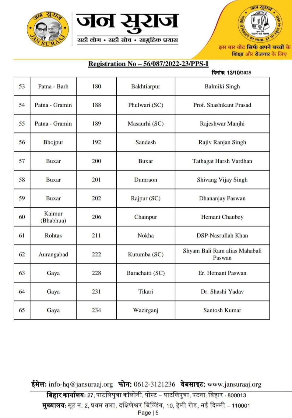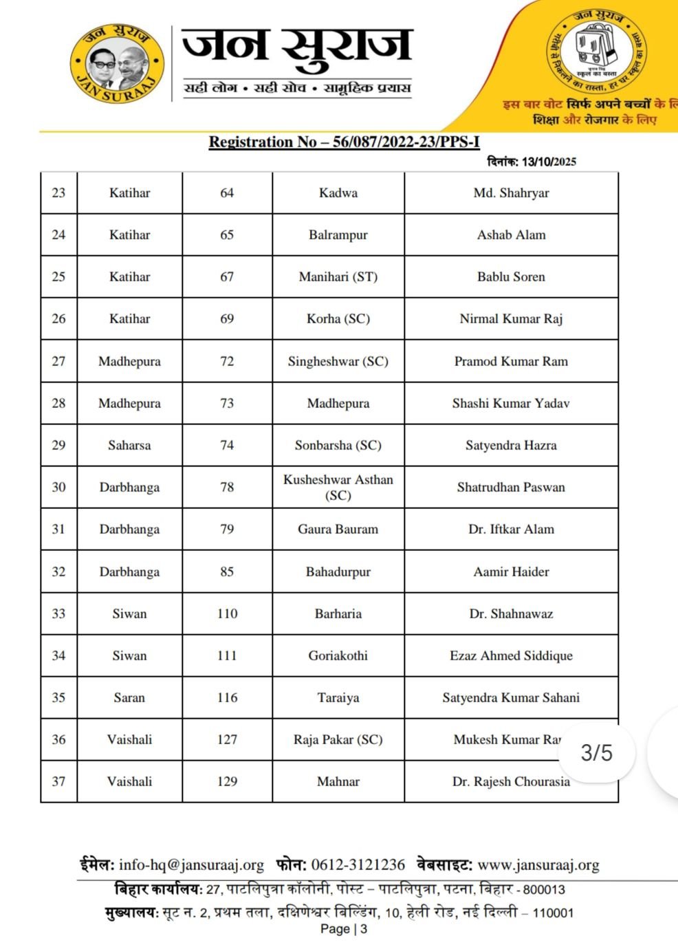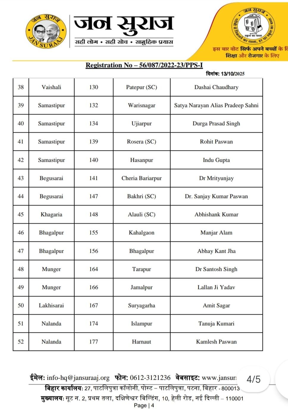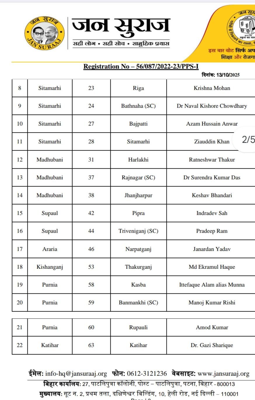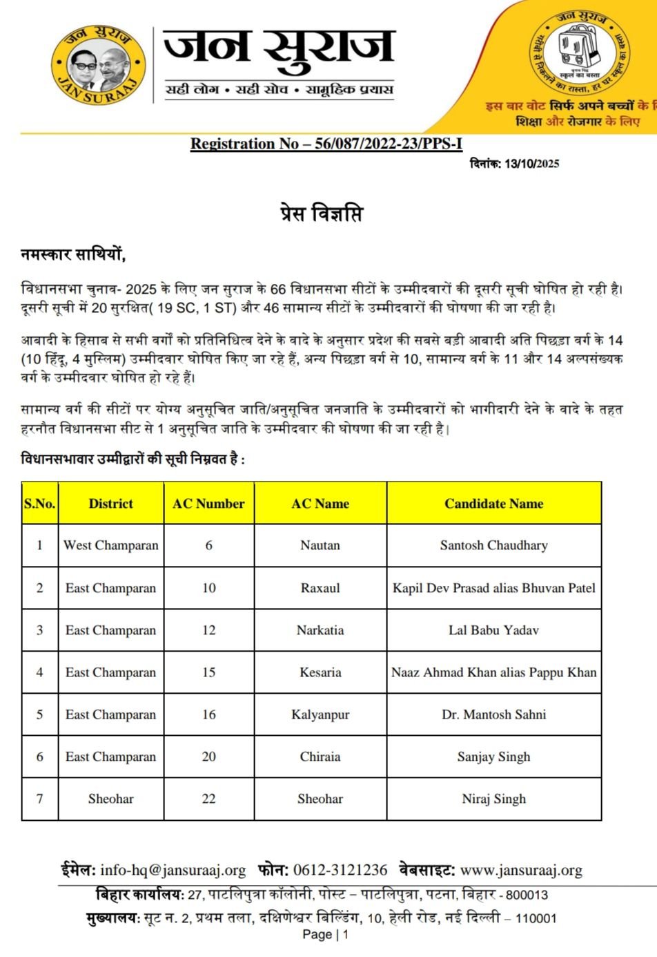 पटना: बिहार विधानसभा चुनाव 6 और 11 नवंबर को होने वाले हैं और 14 नवंबर को इसके नतीजे आने वाले हैं. इसके लिए तमाम पार्टियों ने जीत के लिए अपनी पूरी ताकत झोंक दी है. भारतीय जनता पार्टी कांग्रेस राष्ट्रीय जनता दल और कई छोटे बड़े दल चुनावी मैदान में हैं. इसी बीच खबर आ रही है कि प्रशांत किशोर की पार्टी जनसुराज पार्टी ने अपने उम्मीदवारों की दूसरी सूची भी जारी कर दी है देखें