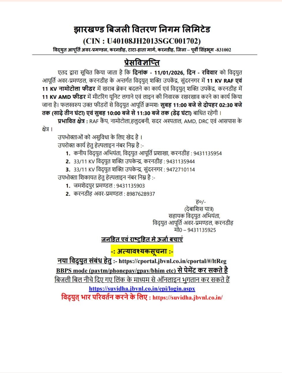 जमशेदपुर: रविवार` को विद्युत आपूर्ति अवर-प्रमण्डल, करनडीह के अन्तर्गत विद्युत् शक्ति उपकेंद्र, सुंदरनगर में `11 KV RAF एवं 11 KV नामोटोला` फीडर में खराब ब्रेकर बदलने का कार्य एवं विद्युत् शक्ति उपकेंद्र, करनडीह में `11 KV AMD` फीडर में मीटरिंग यूनिट लगाने एवं लाइन की निवारक रखरखाव करने का कार्य किया जाना है।