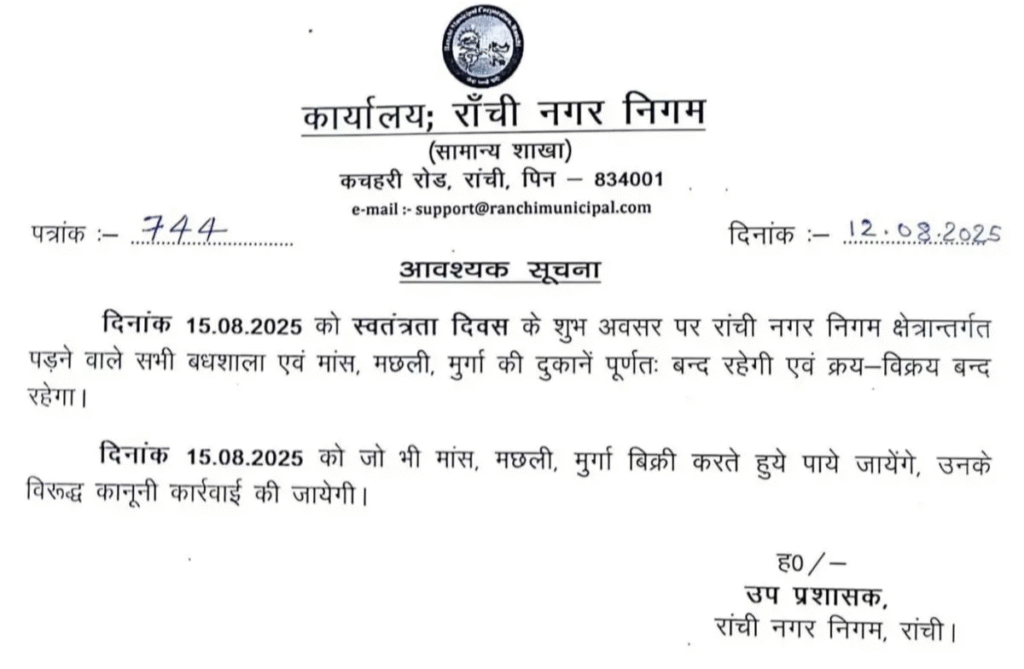 रांची: रांची नगर निगम (RMC) ने आदेश जारी किया है कि 15 अगस्त 2025 (शुक्रवार) को स्वतंत्रता दिवस के अवसर पर रांची में सभी मांस, मछली और चिकन की दुकानें बंद रहेंगी। इस दिन इनकी खरीद-बिक्री पूरी तरह प्रतिबंधित होगी।
