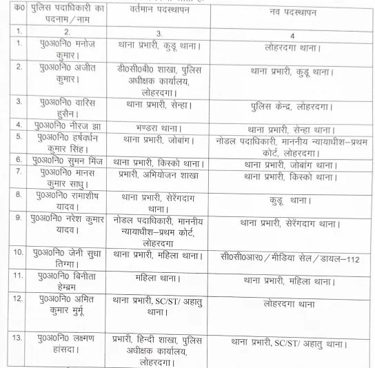लोहरदगा:जिले के पुलिस कप्तान ने जिले के कई थाना प्रभारी का तबादला कर दिया है। इसका आदेश गुरुवार को जारी किया गया।