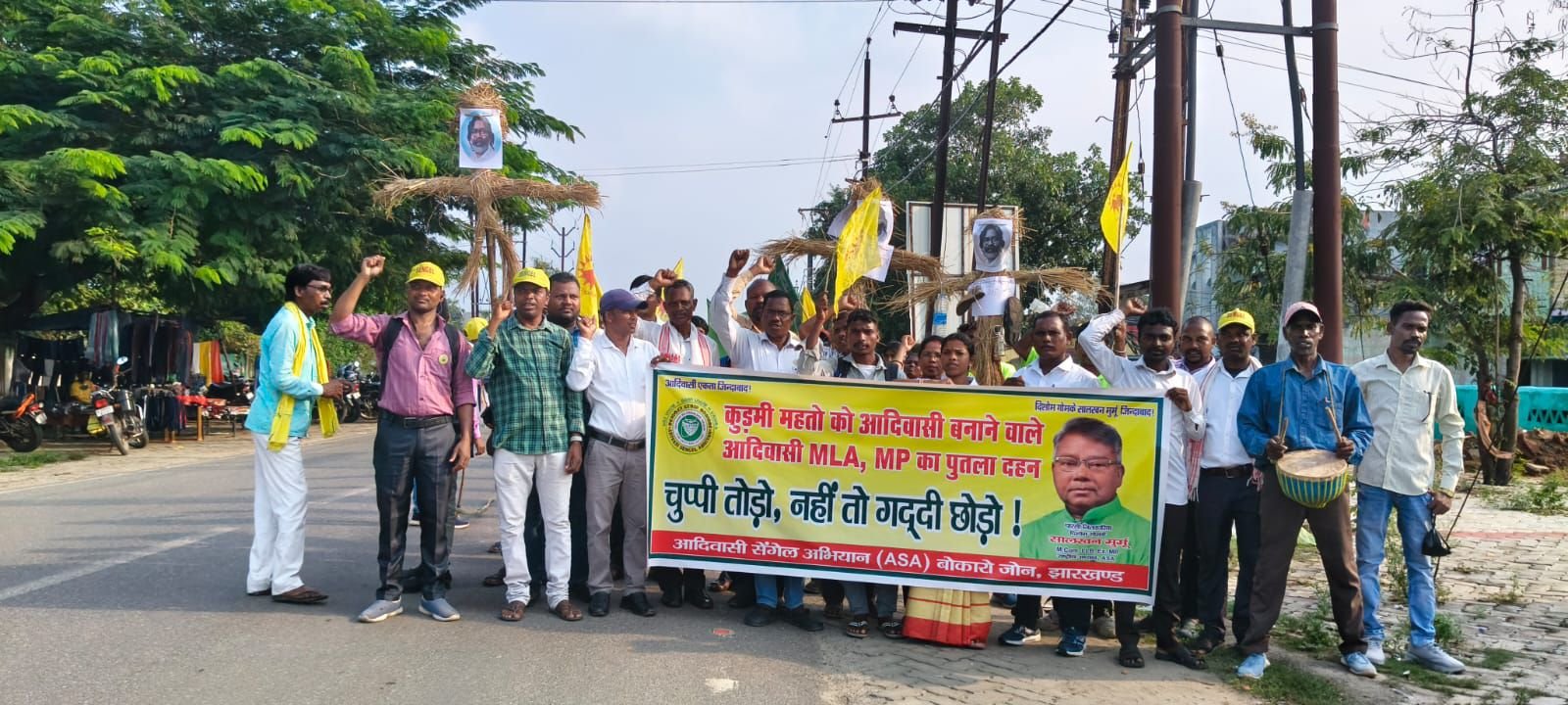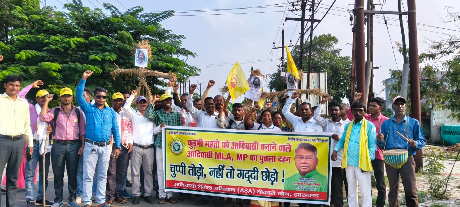 बोकारो: तिलका मुर्मू चौक,जैनामोड़ में आदिवासी सेंगेल अभियान की तरफ से कुरमी महतो को कथित रूप से आदिवासी बनाने वाले मुख्यमंत्री हेमंत सोरेन सहित 28 आदिवासी MLA(बसंत सोरेन,लुइस मरांडी, हेमलाल मुर्मू, धनंजय सोरेन,स्टीफन मरांडी,आलोक सोरेन,जगत माझी,दीपक बिरुआ,निरल पुरती,दशरथ गगराई, विकास मुंडा,भूषण तिर्की,जिगा सुसारन होरो,रामसुर्य मुंडा, गणेश महली,सुखराम उरांव,शिल्पी नेहा तिर्की, रामेश्वर उरांव, परितोष सोरेन, संजीव सरदार,सोना राम सिंकू,सुदिप गुरिया, राजेश कच्छप,चमरा लिंडा,भूषण बारा,नमन विक्सल कोंगाड़ी, रामचंद्र सिंह )/5 आदिवासी MP एवं दो सामान्य सीट के विधायक बाबुलाल मरांडी और कल्पना सोरेन का पुतला दहन किया गया।