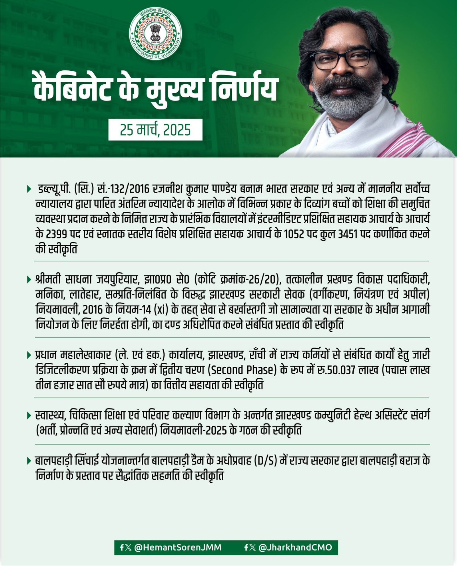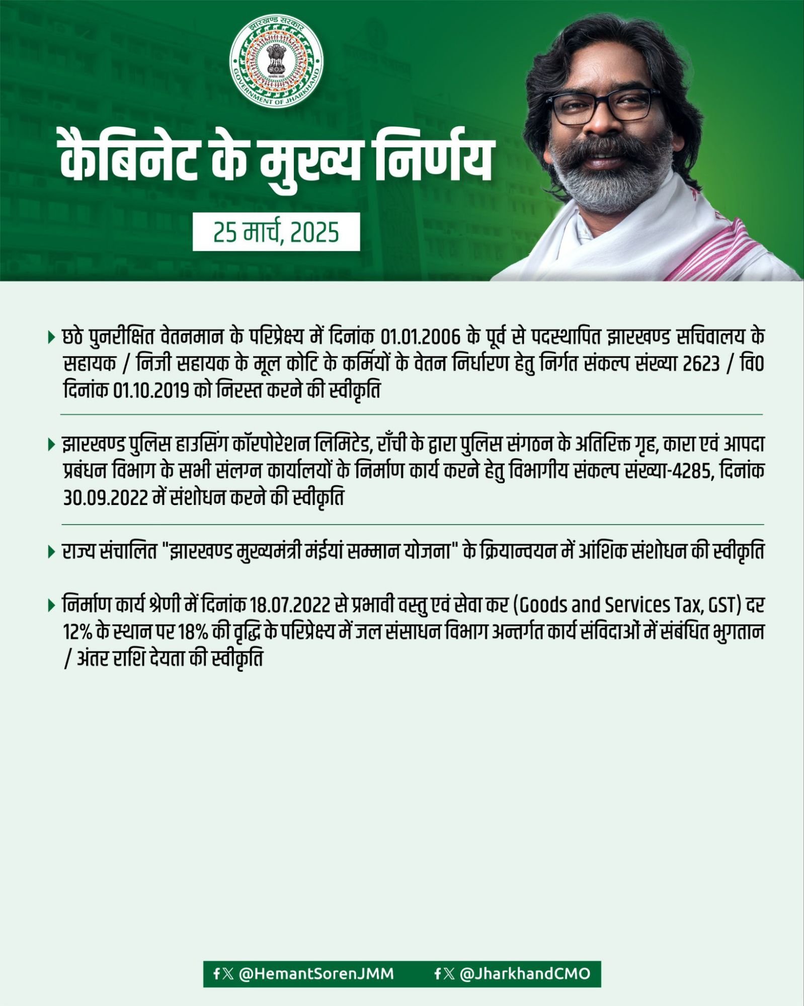 मंईंयां सम्मान योजना में आंशिक संशोधन के साथ-साथ हेमंत कैबिनेट की बैठक में कई महत्वपूर्ण निर्णय