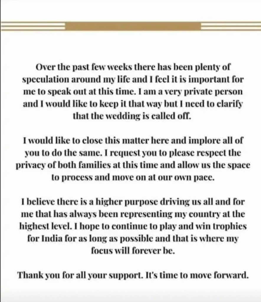 मंधाना ने लिखा, “पिछले कुछ हफ़्तों से मेरी ज़िंदगी को लेकर बहुत सारे अंदाज़े लगाए जा रहे हैं और मुझे लगता है कि अब मेरे लिए बोलना ज़रूरी है। मैं बहुत प्राइवेट इंसान हूं और इसे ऐसे ही रखना चाहती हूं, लेकिन यह साफ़ करना चाहती हूं कि शादी कैंसिल हो गई है। मैं इस मामले को यहीं खत्म करना चाहूंगी और आप सभी से भी यही करने की गुज़ारिश करती हूं। दोनों परिवारों की प्राइवेसी का सम्मान करें और हमें अपनी रफ़्तार से आगे बढ़ने का मौका दें।”