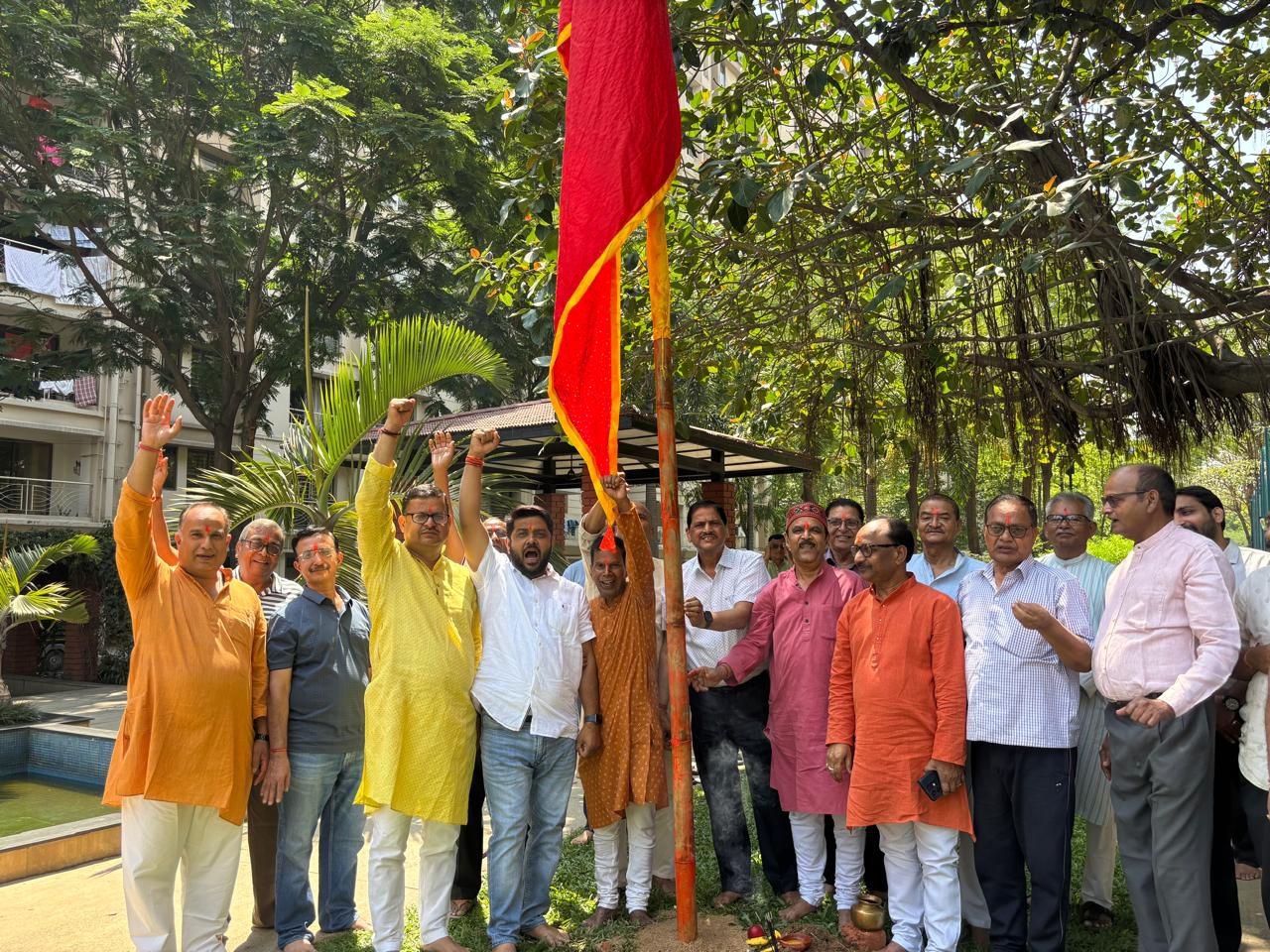सोसायटी के विकास सिंह ने बताया की सोसाइटी में 394 फ्लैट है सभी फ्लैट धारकों ने सामूहिक रूप से संकल्प लेकर सोसाइटी की रक्षा हेतु महावीर जी का ध्वज प्रांगण में लगाकर हनुमान चालीसा का सामूहिक पाठ किया ।