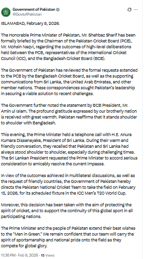 सरकारी बयान में कहा गया, ‘इन सभी पहलुओं पर विचार करने के बाद पाकिस्तान सरकार पाकिस्तान क्रिकेट टीम को निर्देश देती है कि वह 15 फरवरी 2026 को टी20 विश्व कप में अपने तय मुकाबले के लिए मैदान में उतरे।‘