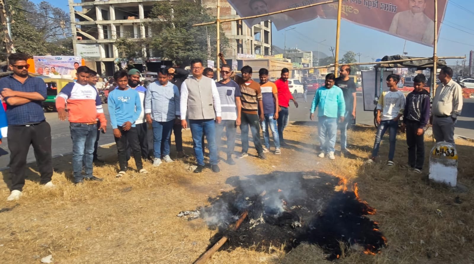 N H 33 के एलिवेटेड कॉरिडोर के कार्य शुरू होने के दो महीने बाद 3 बार भूमि पूजन,भड़के लोग,NHAI का पुतला फूंका