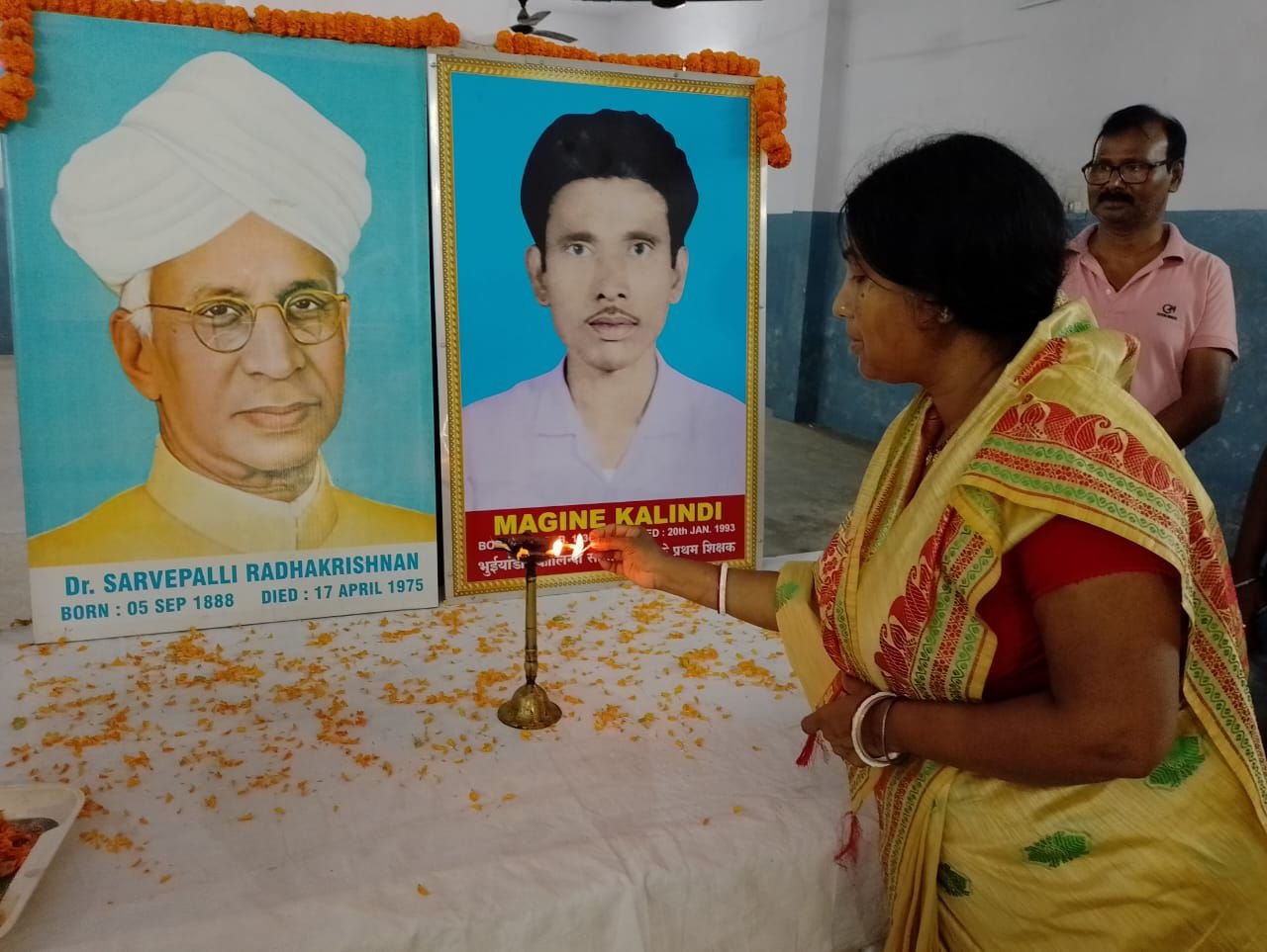 सर्वप्रथम कार्यक्रम में देश के प्रथम शिक्षक डॉक्टर सर्वपल्ली राधाकृष्णन महात्मा गुरु ज्योतिबा फुले माता सावित्रीबाई फुले एवं कालिंदी समाज विद्यालय के प्रथम शिक्षकLate Magine kalindi के चित्र पर माल्यार्पण एवं दीप प्रचलित कर कार्यक्रम का शुभारंभ किया गया ।