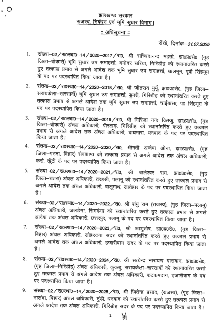 रांची: झारखंड सरकार ने गुरुवार को बड़े पैमाने पर अंचलाधिकारियों का तबादला किया है। राजस्व, निबंधन एवं भूमि सुधार विभाग ने इसकी अधिसूचना देर शाम जारी कर दी है।