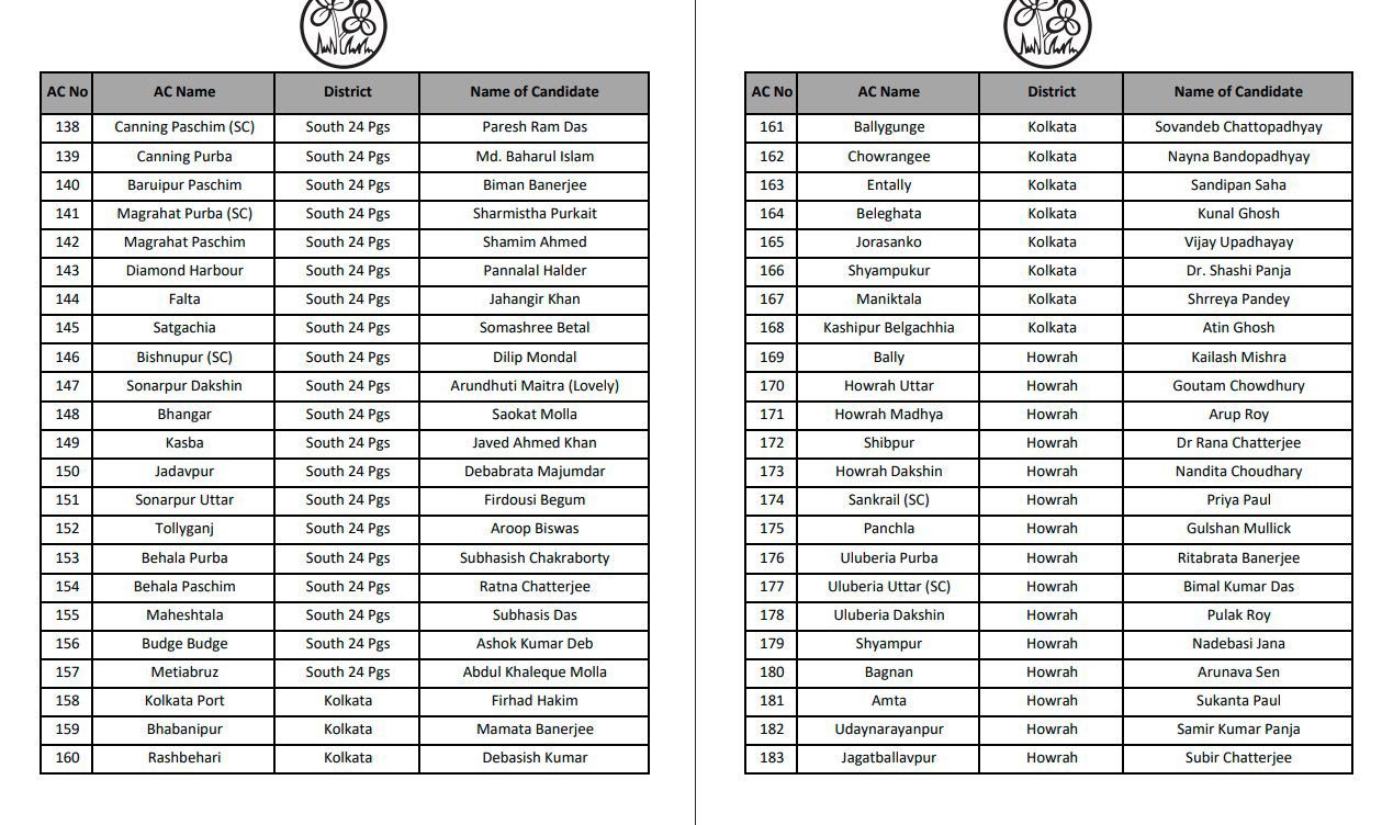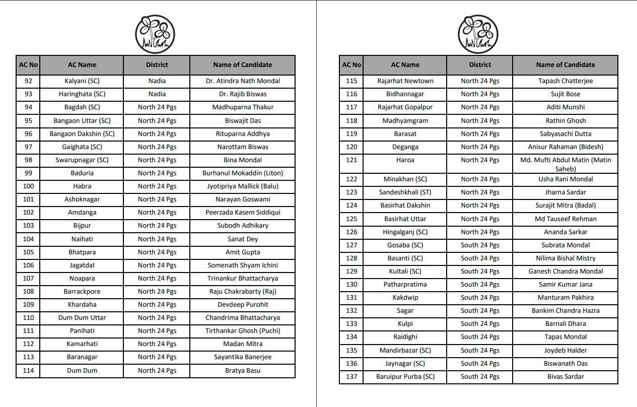 तृणमूल कांग्रेस ने चंद्रिमा भट्टाचार्य को दम दम उत्तर सीट से, मदन मित्रा को कमरहाटी सीट से, फिरहाद हकीम को कोलकाता पोर्ट सीट से, कुणाल घोष को बेलेघाटा सीट से, डॉ. शशि पांजा को श्यामपुकुर सीट से, ज्योतिप्रियो मल्लिक को हाबरा सीट से चुनावी मैदान में उतरा है. अभिषेक बनर्जी ने कहा कि पश्चिम बंगाल चुनाव में टीएमसी के 291 उम्मीदवारों में से 52 महिलाएं, 95 अनुसूचित जाति-अनुसूचित जनजाति और 47 अल्पसंख्यक हैं.